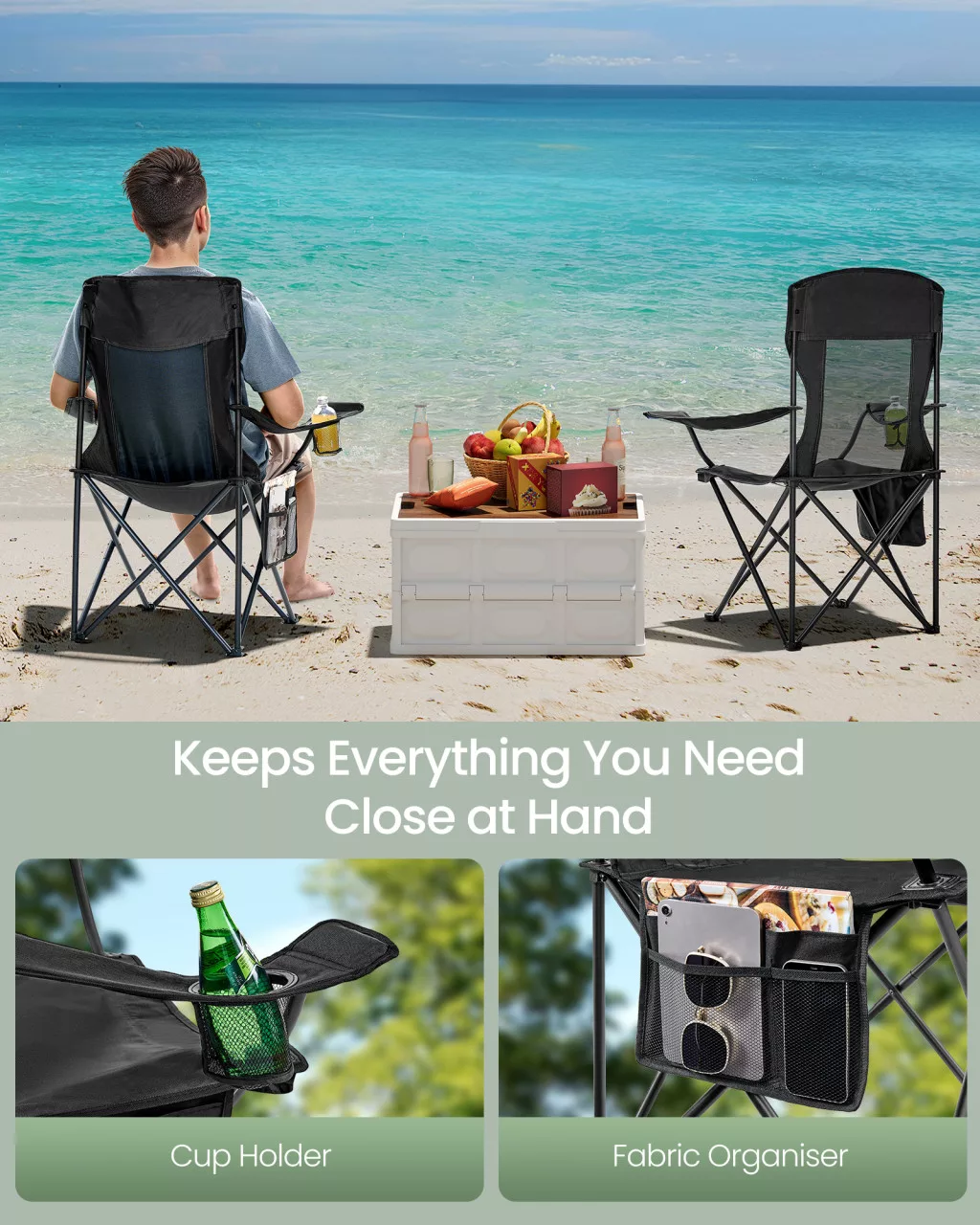 • Integrált italtartó és tárolózseb: Az italok és apró tárgyak mindig kéznél vannak, így teljes mértékben élvezheti a szabadtéri programokat