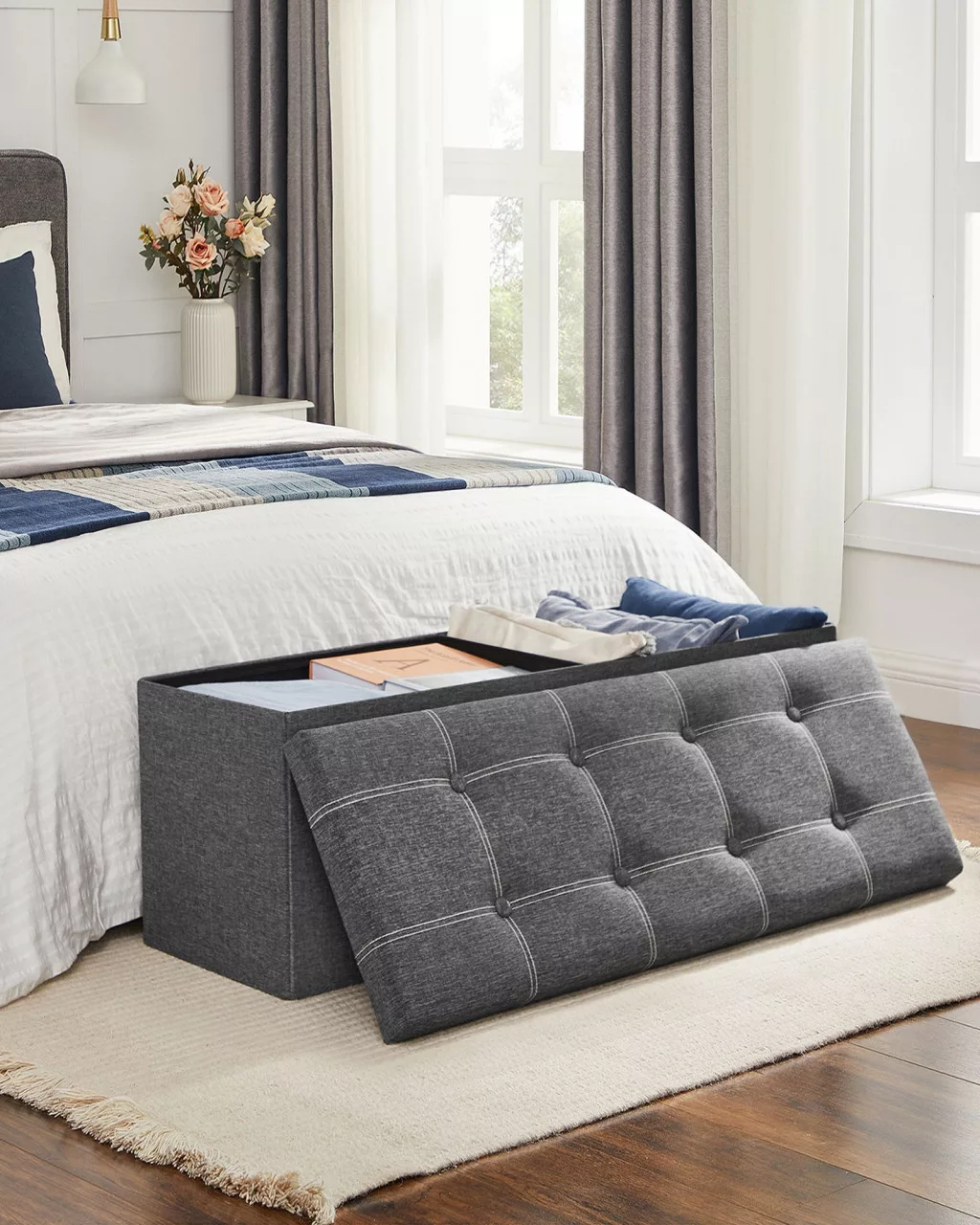 Tágas tároló ülőpad elegáns, semleges dizájnnal, amely 300 kg-ig terhelhető és összecsukható kialakításának köszönhetően könnyedén elrakható, ha éppen nincs használatban.