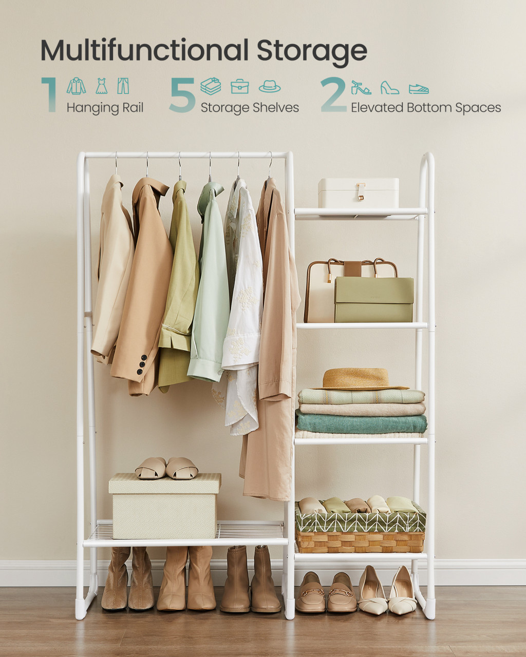 • Multifunkcionális kialakítás: 1 akasztórúd és 5 tárolópolc kombinációja lehetővé teszi, hogy ruhák, táskák, cipők és kiegészítők egyaránt rendezett helyet kapjanak