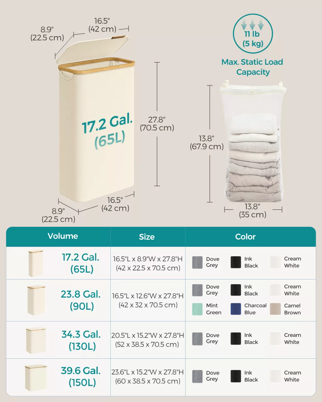 Karcsú, helytakarékos szennyeskosár 65 literes kapacitással, amely tökéletesen illeszkedik szűk helyekre is. Vízálló Oxford anyagból készült, kivehető hálós betéttel és elegáns bambusz fogantyúval.