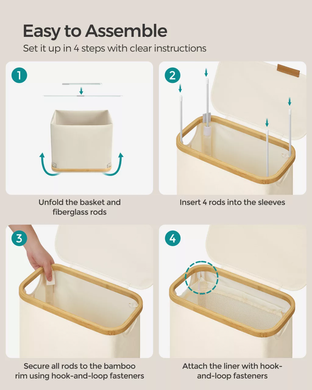 • Fedél bambusz fogantyúval: A fedél nemcsak eltakarja a szennyest és védi a magánéletet, hanem a bambusz keret elegáns dizájnelemet is ad, miközben könnyű nyitást biztosít