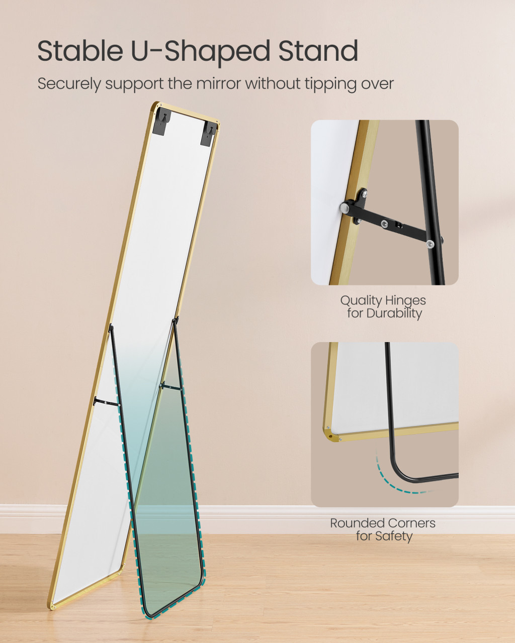 Elegáns, teljes alakos álló tükör halvány arany alumínium kerettel és edzett biztonsági üveggel. Tökéletes választás hálószobába, nappali vagy öltözőbe, amely nemcsak funkcionális, hanem dekoratív kiegészítő is.