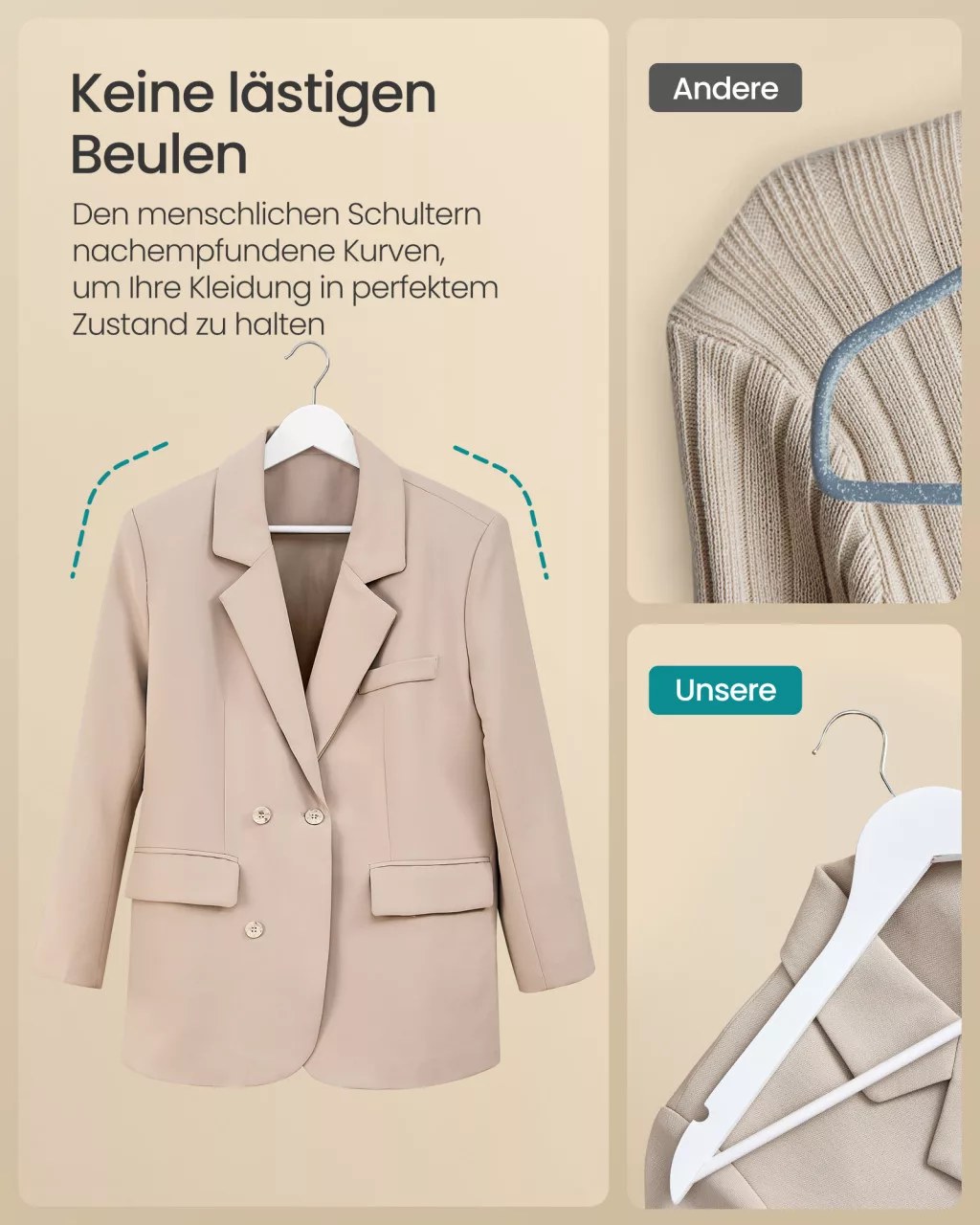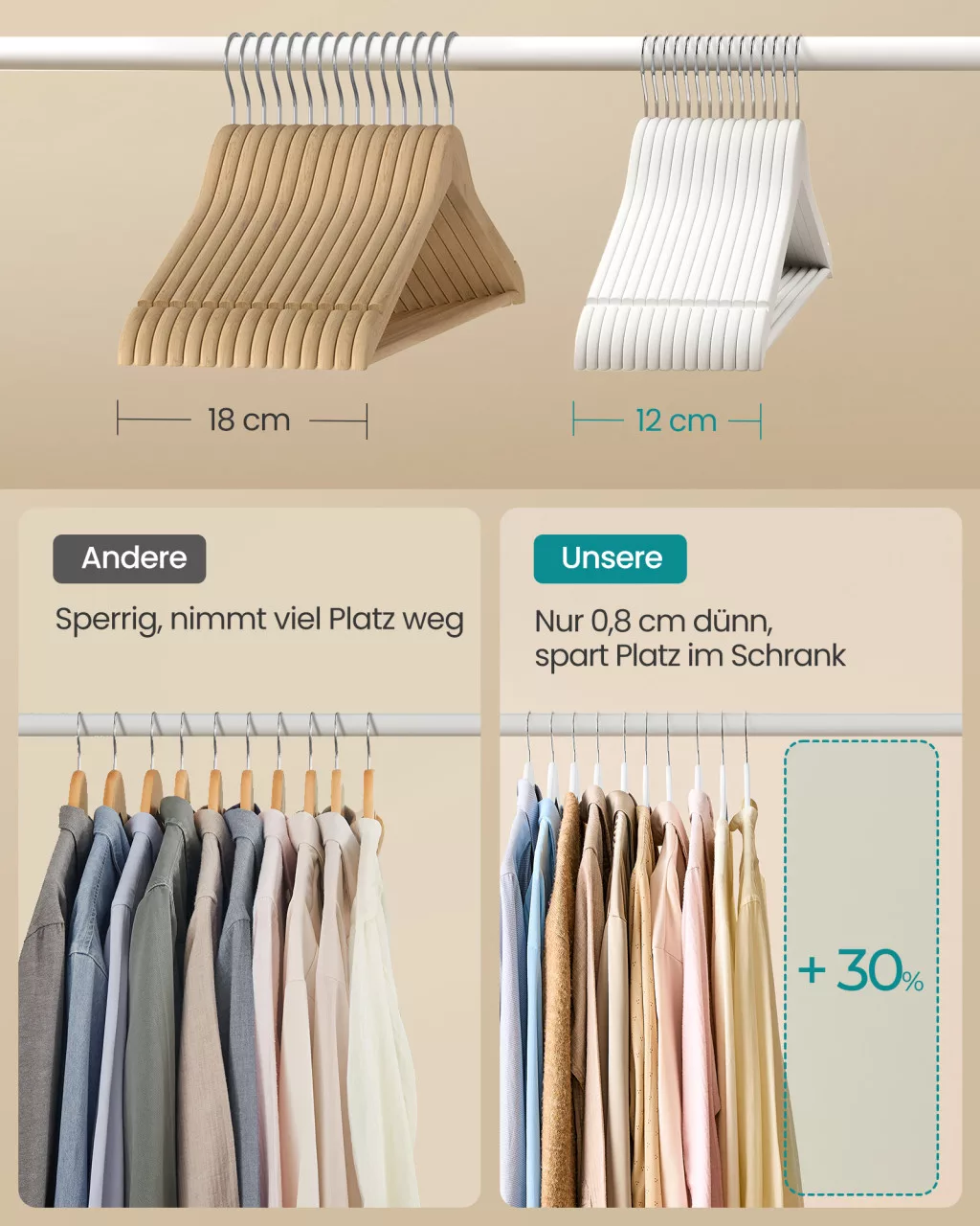• Tartós minőség: A prémium nyírfa és acél kombináció garantálja a hosszú élettartamot, minden vállfa akár 5 kg terhelést is elbír, így nehéz téli kabátokhoz is tökéletes