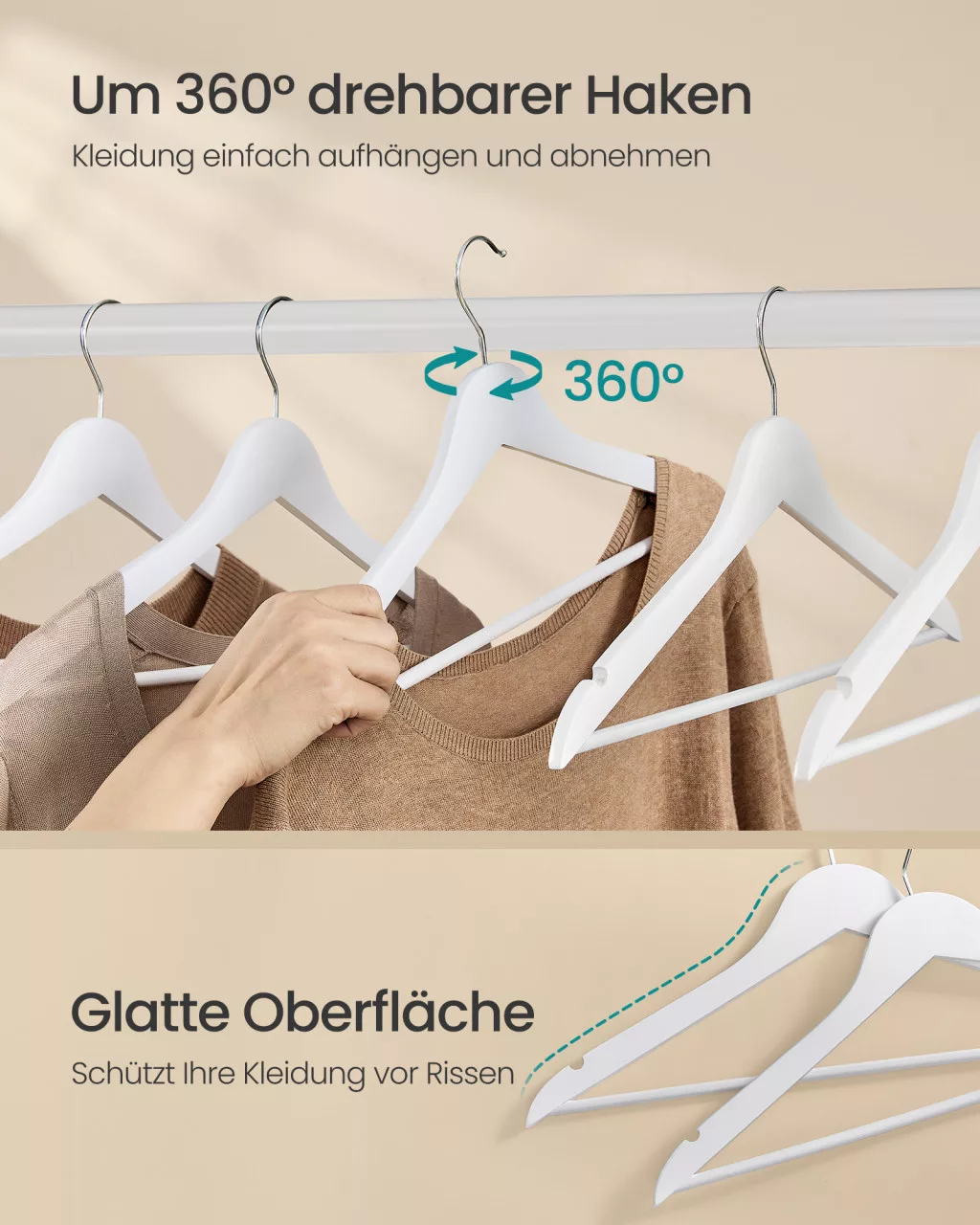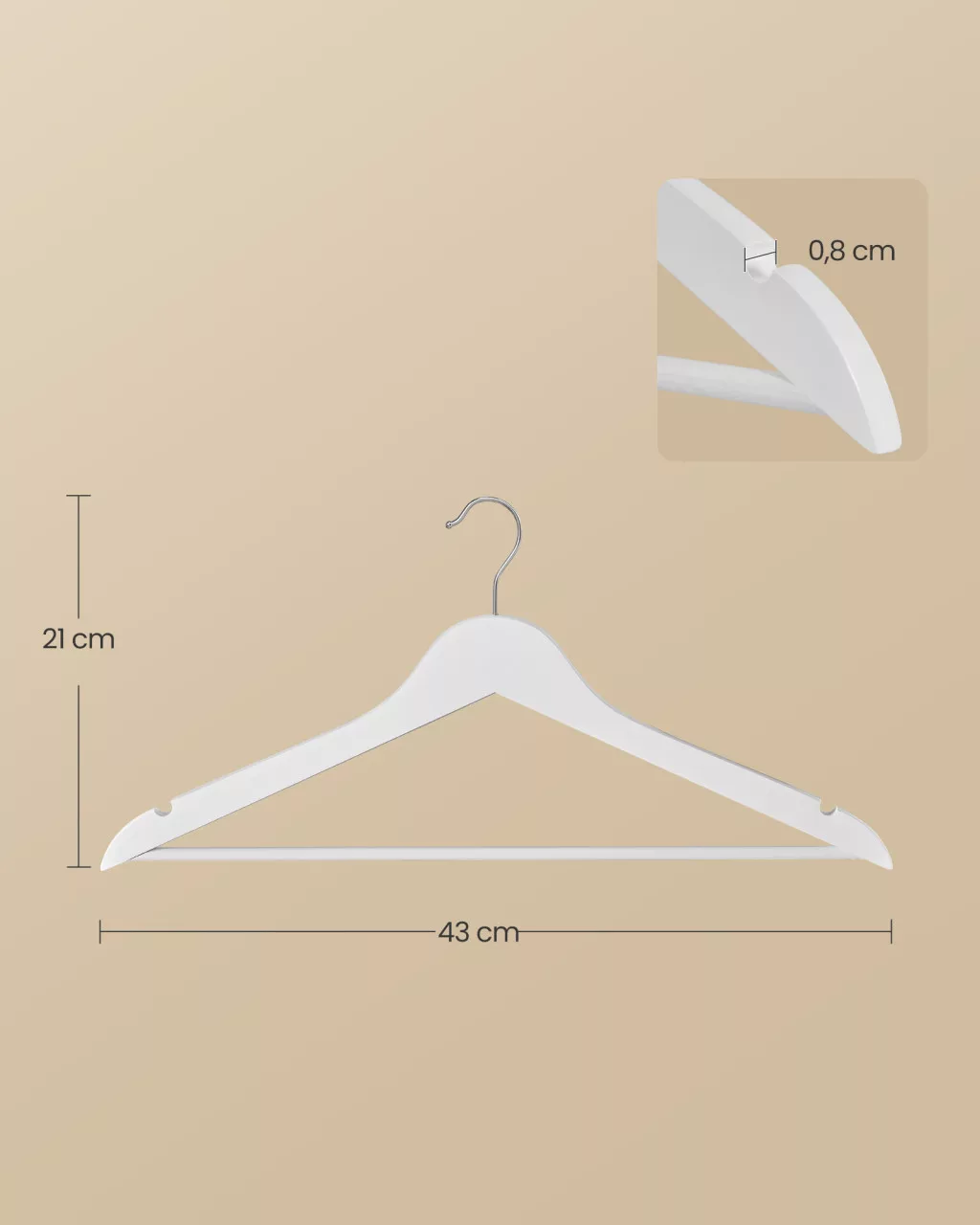 Prémium minőségű nyírfa ruhavállfa készlet, amely helytakarékos megoldást kínál a ruhatár rendszerezéséhez. A vállfa ergonomikus kialakítása megóvja ruháit a nyomok kialakulásától, míg a 360°-ban forgó akasztó maximális kényelmet biztosít.