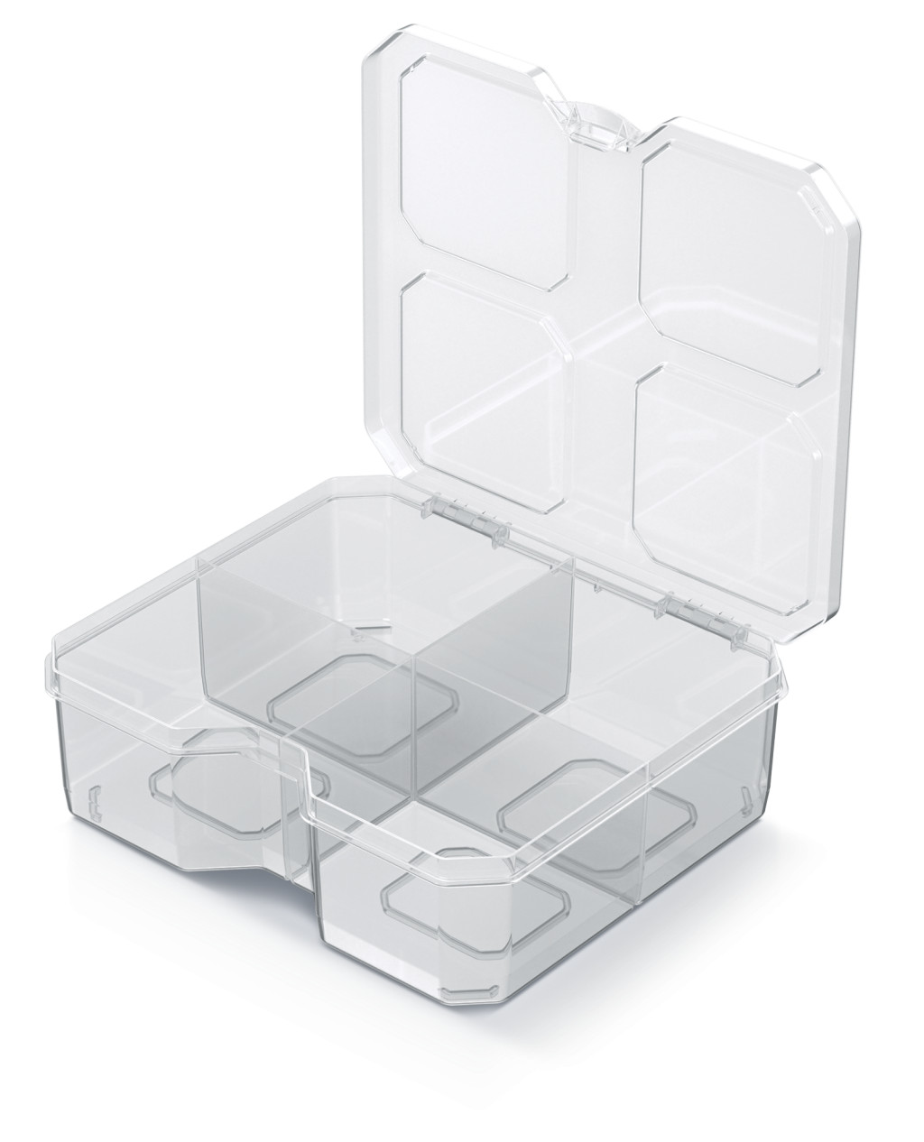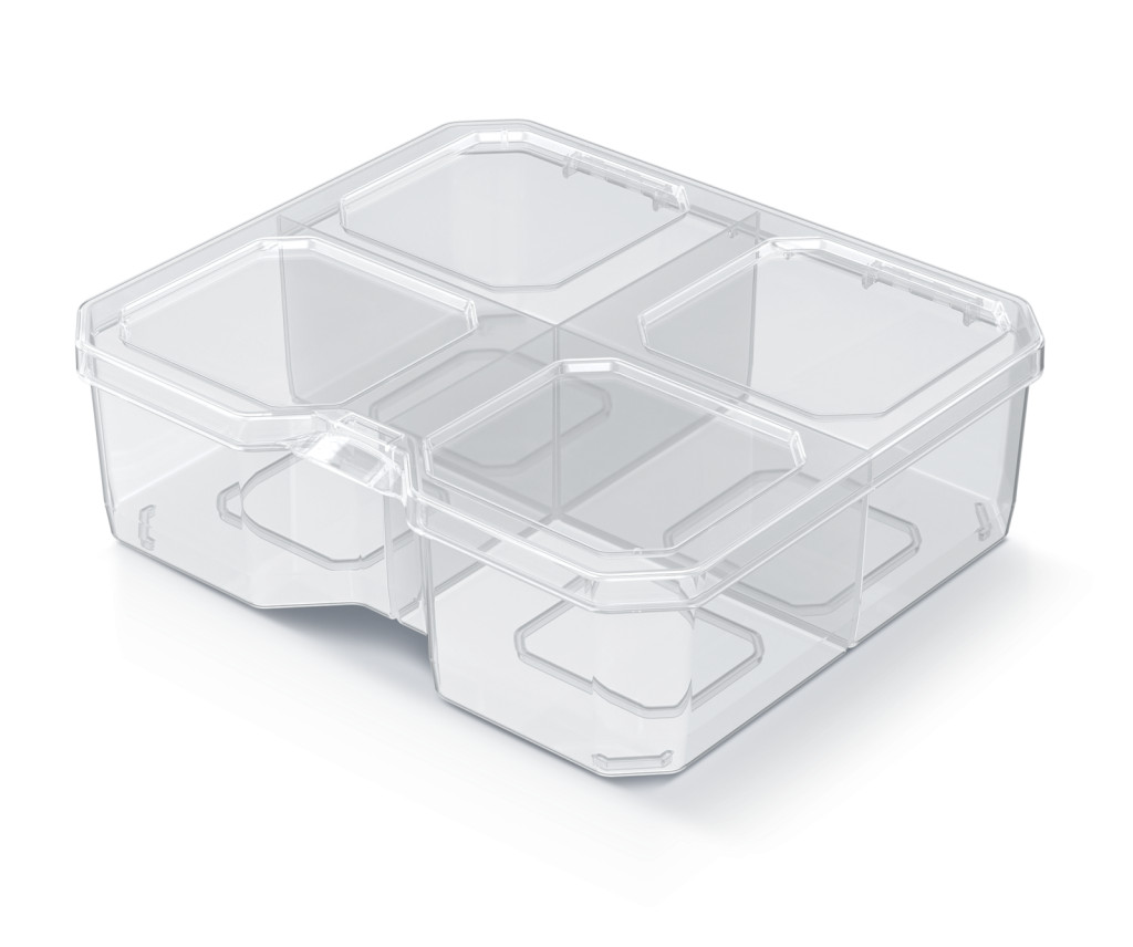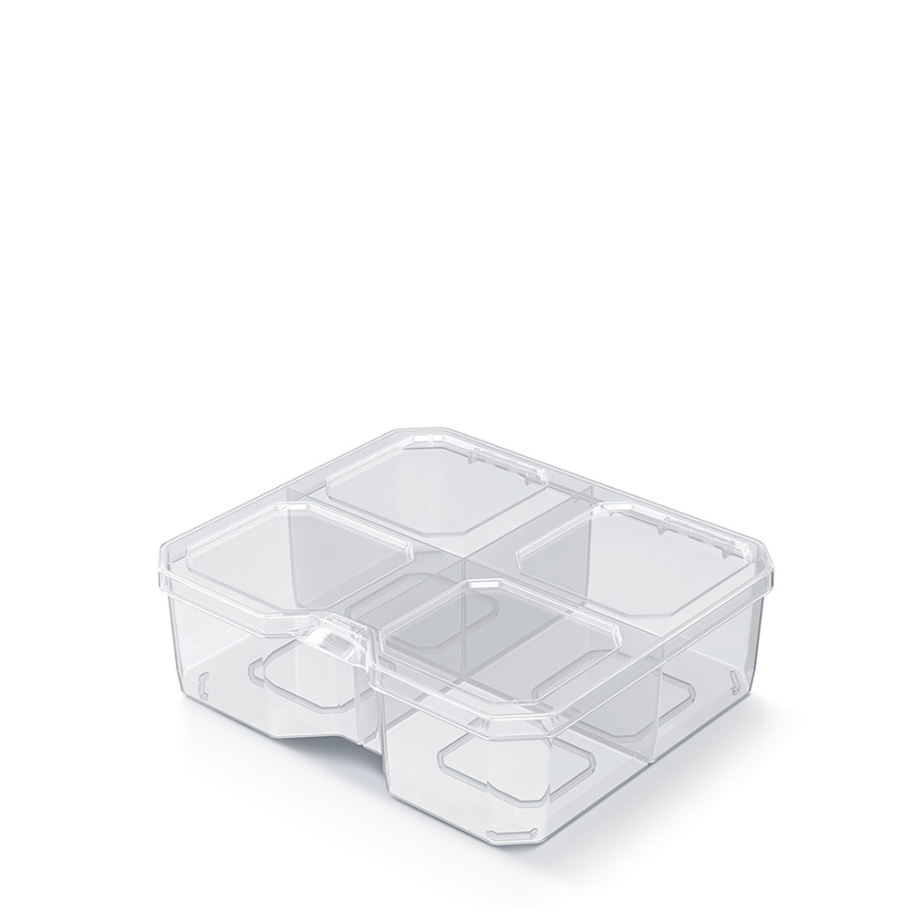 Praktikus, 4 rekeszes átlátszó szerszámrendező doboz fix elválasztókkal, ideális kisebb alkatrészek és szerszámok rendszerezett tárolásához.