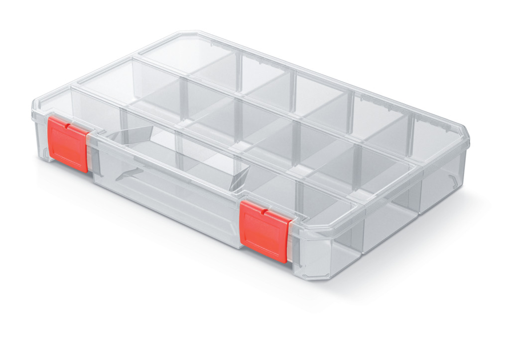 Praktikus, átlátszó szerszámrendező doboz 11 rekesszel és 8 kivehető elválasztóval, ideális kisebb alkatrészek és szerszámok rendszerezett tárolásához.