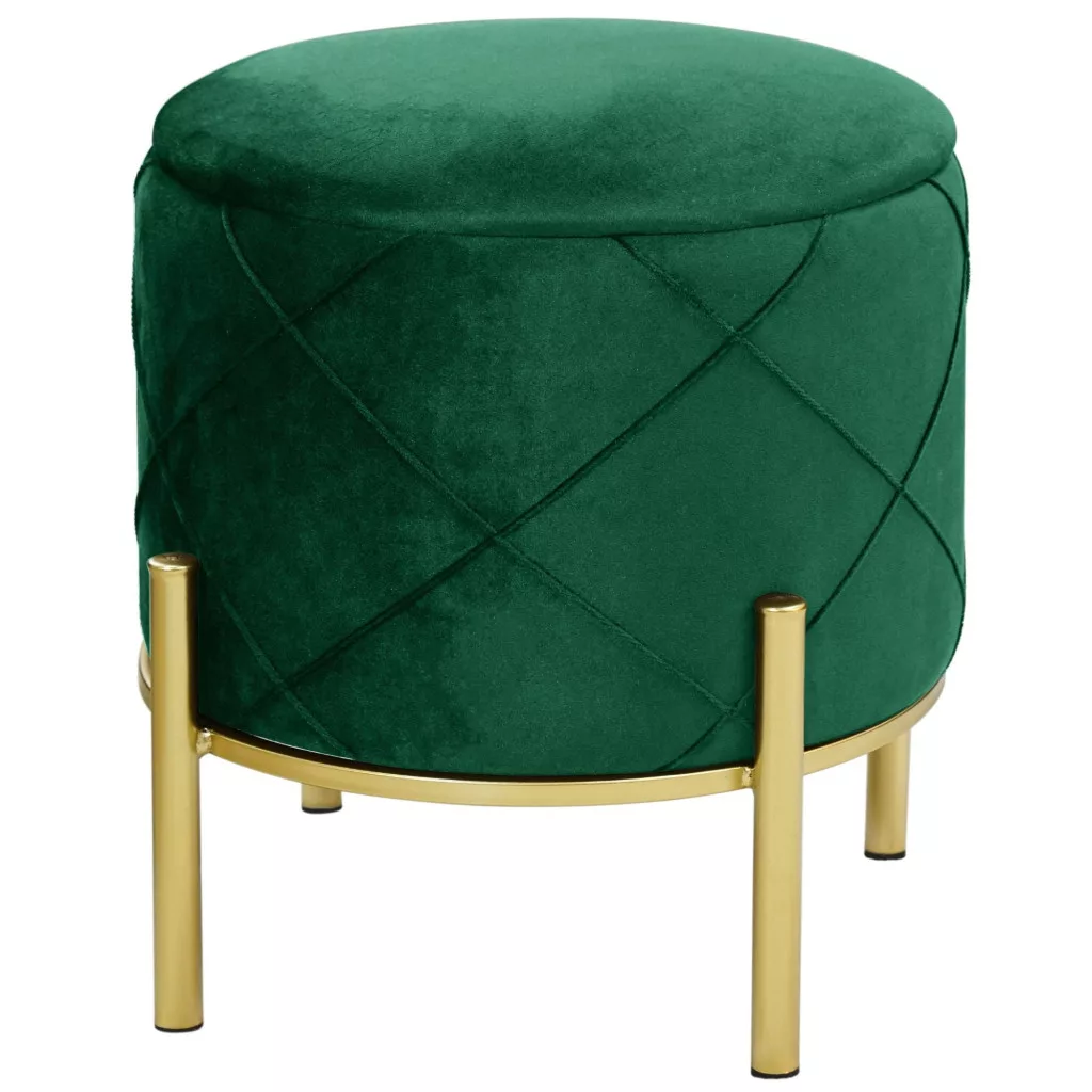 Elegáns, palackzöld velúr puff beépített tárolóval és arany színű fém lábakkal, amely tökéletes kiegészítője modern otthonának.