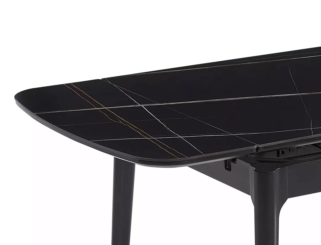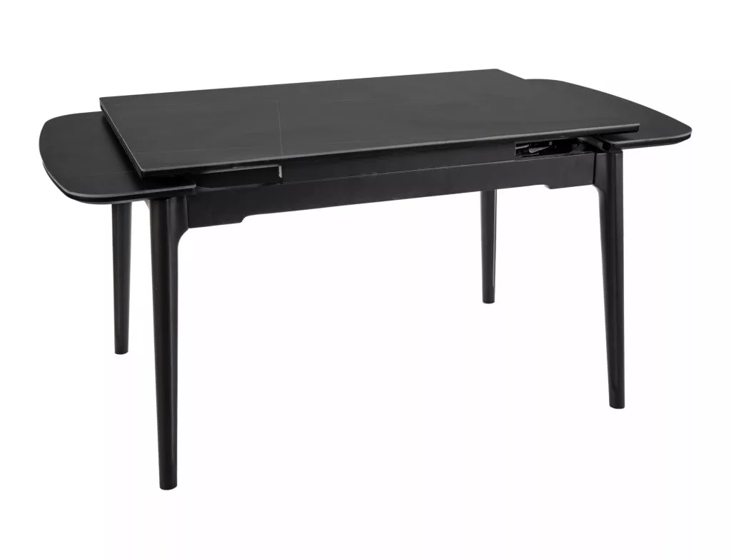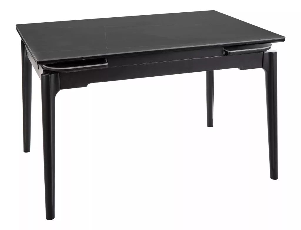 Elegáns, kihúzható étkezőasztal kerámia asztallappal és fa vázzal, modern matt fekete kivitelben.