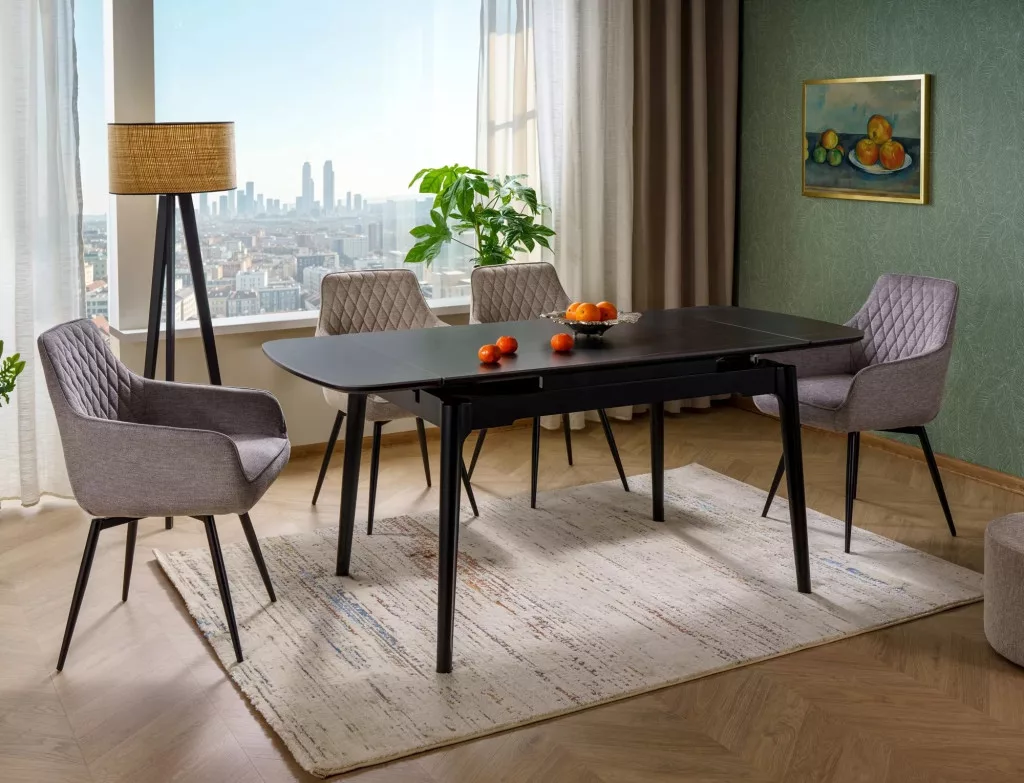 A Sento kihúzható étkezőasztal tökéletes választás a modern otthonokba. A kerámia asztallap nem csak esztétikus megjelenést biztosít, de rendkívül tartós és könnyen tisztítható felületet is nyújt. A matt fekete szín elegáns megjelenést kölcsönöz, míg a fa váz stabilitást és időtálló szerkezetet garantál.