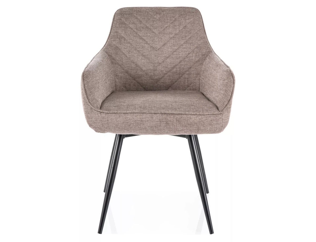 A bézs színű Brego szövet kárpitozás és a matt fekete fém váz elegáns kontrasztot alkotnak, míg a szék karfás kialakítása további kényelmet nyújt. A geometrikus varrásminták a háttámlán modern részletekkel gazdagítják a megjelenést.