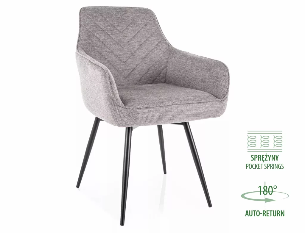 Modern vonalvezetésű, kényelmes étkezőszék 180 fokos forgó funkcióval és automatikus visszatérő mechanizmussal, stílusos szürke szövet kárpitozással és matt fekete fém lábakkal.