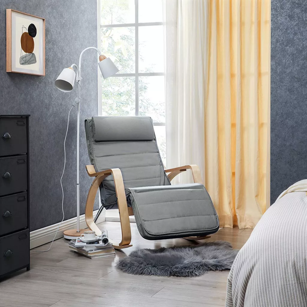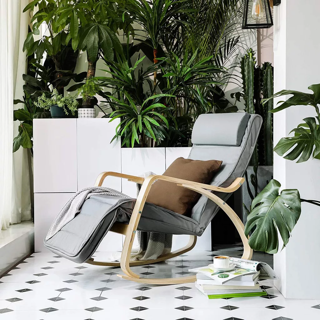 Skandináv stílusú hintaszék prémium nyírfa kerettel, ergonomikus kialakítással és 5 pozícióban állítható lábtartóval a maximális kényelem érdekében.
