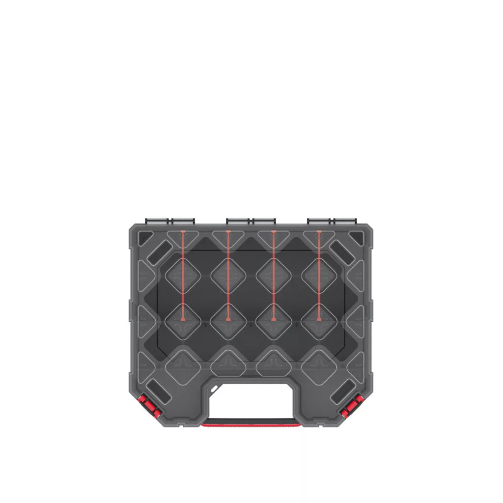 Professzionális szerszámrendező doboz 4 kivehető rekesszel, átlátszó polipropilén fedéllel és megerősített polimer házzal a maximális tartósság érdekében.