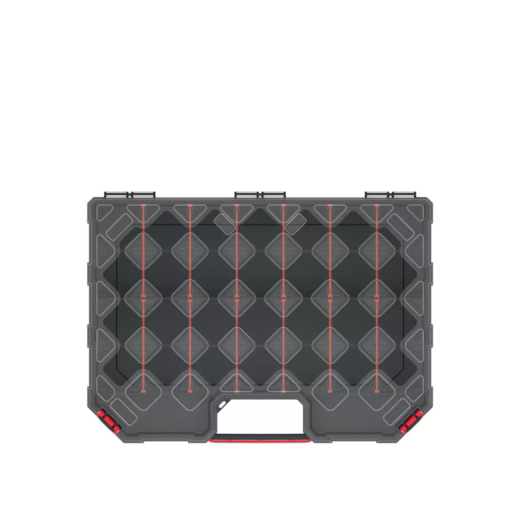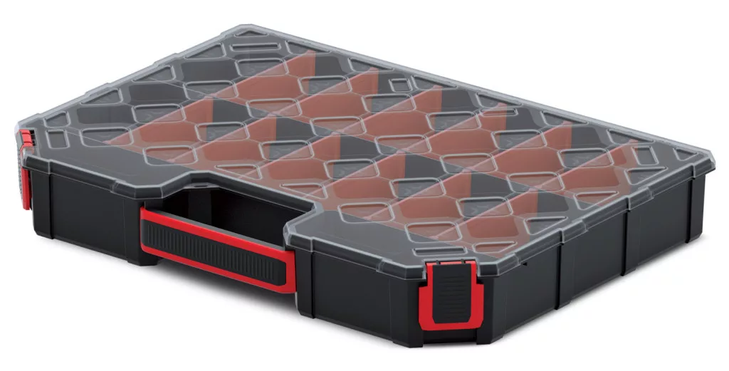 Kompakt, átlátható szerszámrendező 12 kivehető rekesszel és átlátszó polipropilén fedéllel, ideális kisebb szerszámok rendszerezett tárolásához.