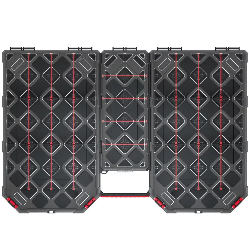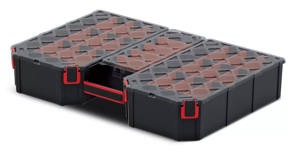 Professzionális szerszámrendező 22 kivehető rekesszel, polikarbonát fedéllel és megerősített polimer házzal a maximális tartósság érdekében.