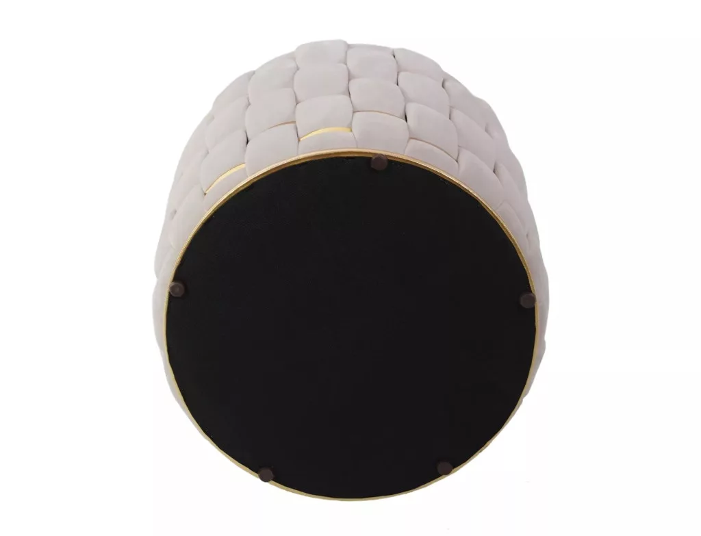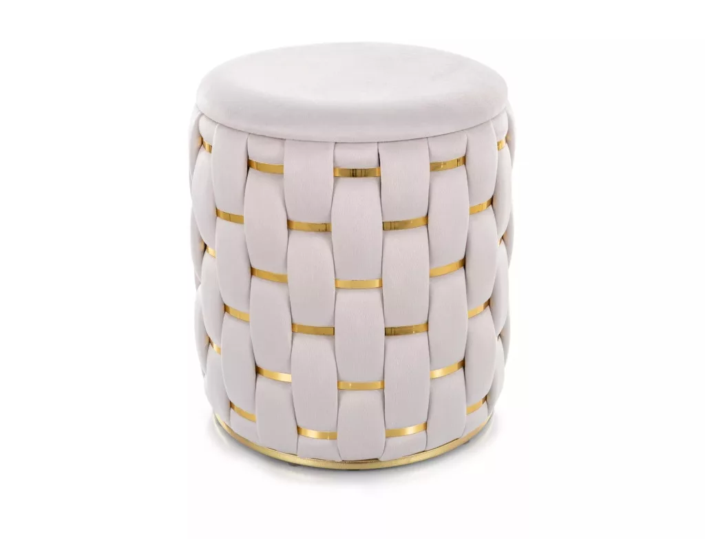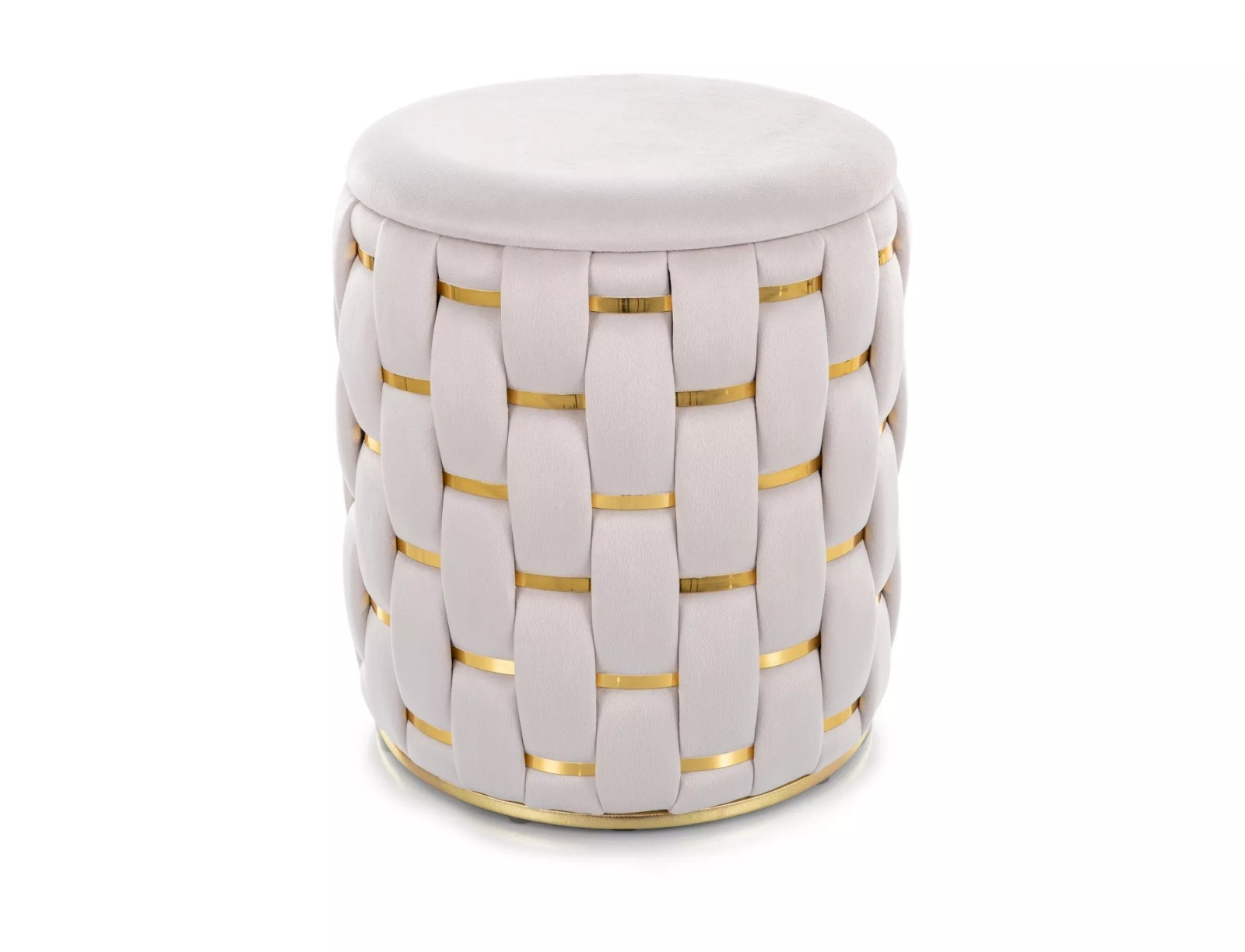 Elegáns, tárolóval ellátott bársony puff egyedi fonott dizájnnal és arany díszítőelemekkel, amely tökéletes kiegészítője lehet bármely modern vagy klasszikus enteriőrnek.