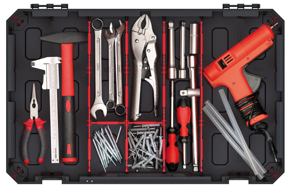 Az ergonomikus fogantyú és az ABS csatok könnyű hordozhatóságot tesznek lehetővé, az elasztomer sarkok pedig extra védelmet nyújtanak. A rendező 20 kg terhelhetőségével ideális választás mind professzionális szakemberek, mind lelkes barkácsolók számára.
