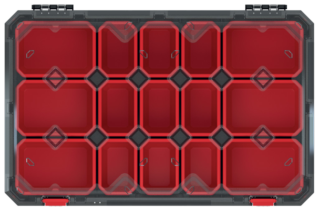 Professzionális szerszámrendező 15 kivehető tárolórekesszel, átlátszó polikarbonát fedéllel és megerősített polimer házzal, amely tökéletes megoldást nyújt a szerszámok és apró alkatrészek rendszerezett tárolására.