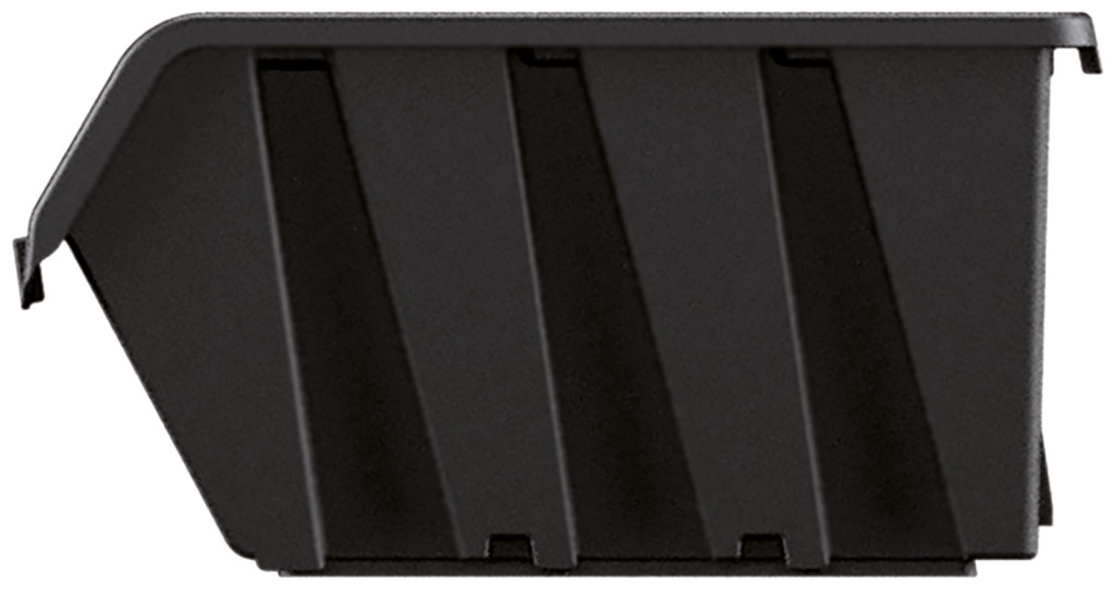 Strapabíró, fekete műanyag műhelytároló rekesz, amely tökéletes megoldást nyújt a szerszámok és alkatrészek rendszerezett tárolására.