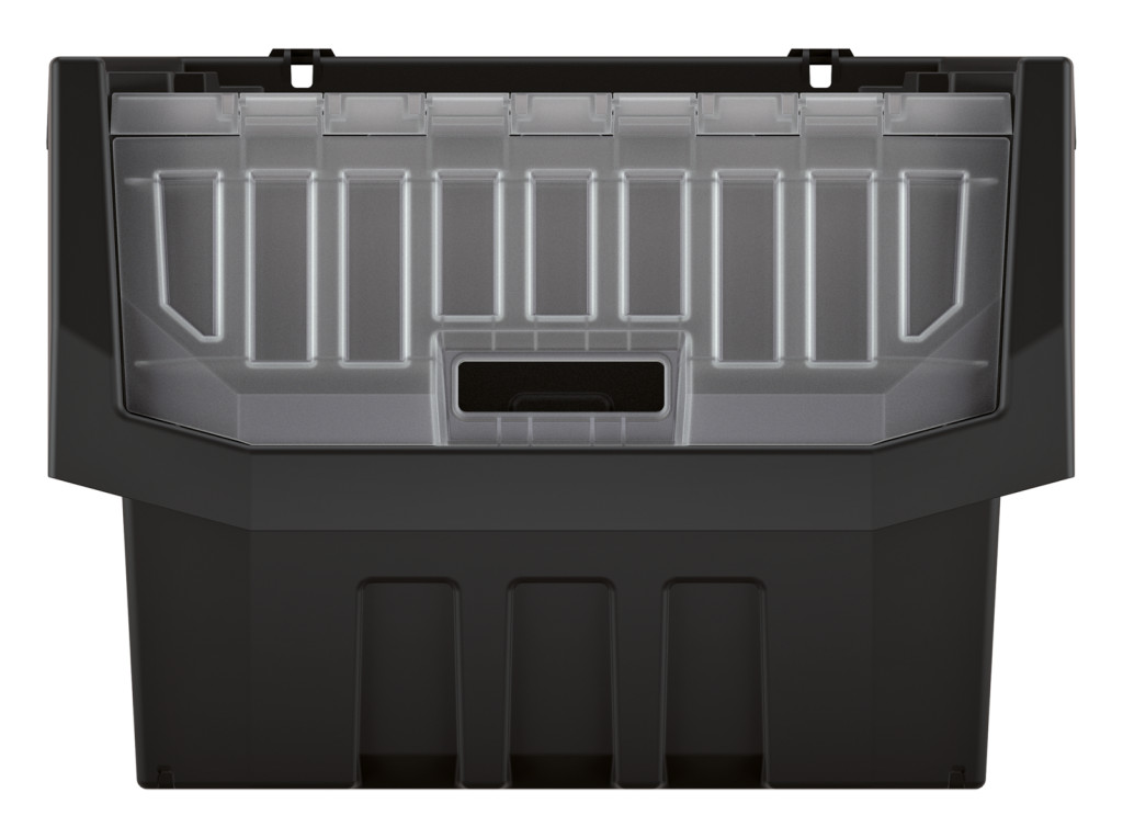 Strapabíró műhelydoboz átlátszó polipropilén fedéllel, praktikus hordozófülekkel és egymásra rakható kialakítással.
