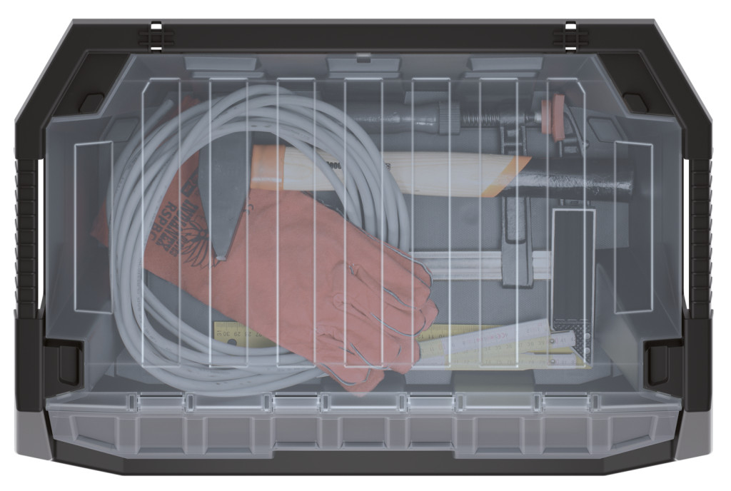 A praktikus kialakítás része a két ergonomikus fogantyú, amely könnyű szállíthatóságot biztosít, valamint a rögzítési pontok és az egymásra helyezhetőség, ami maximális helykihasználást tesz lehetővé.