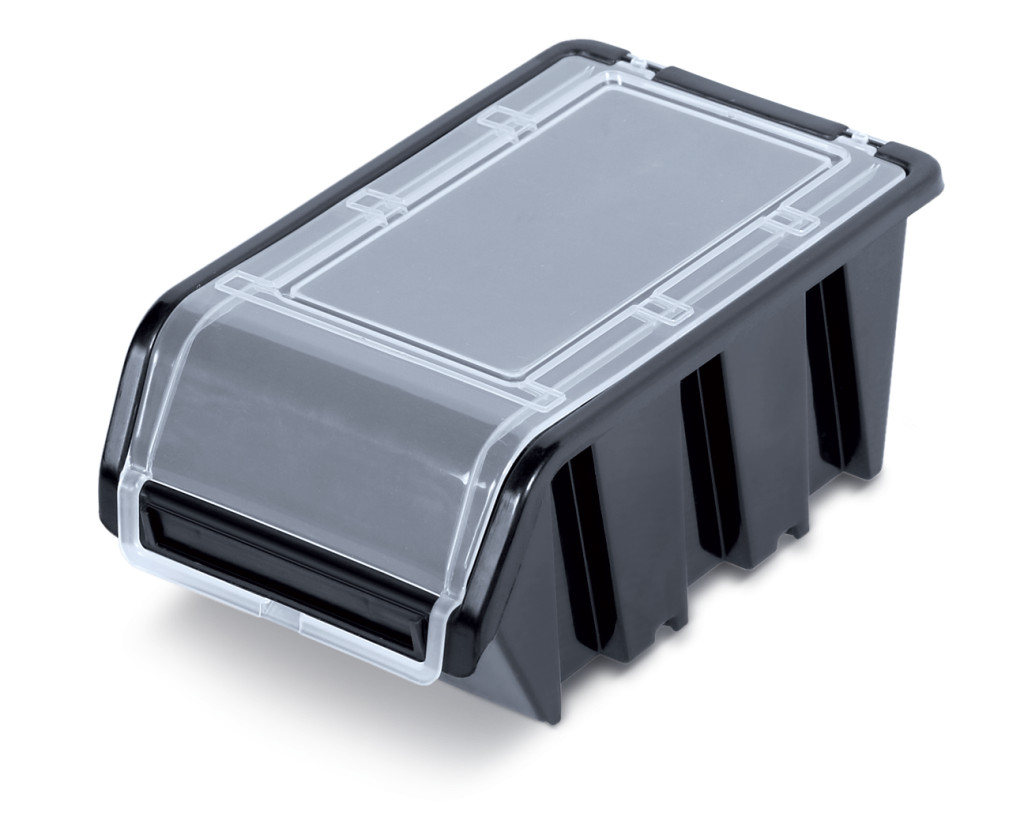 Kompakt, strapabíró műhelyfiók átlátszó polipropilén fedéllel, ideális alkatrészek és szerszámok rendszerezett tárolásához.