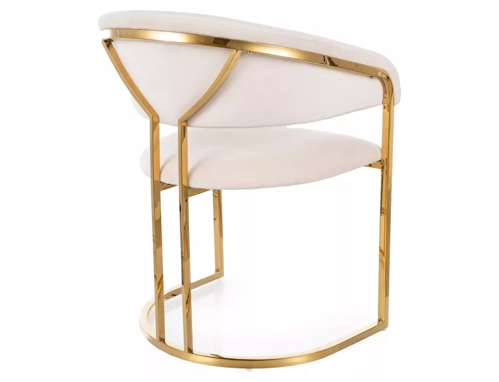A Tulipe Velvet étkezőszék a modern luxus megtestesítője, amely ötvözi a kifinomult dizájnt a funkcionalitással. Az ívelt háttámla és a puha bársony kárpitozás nem csak szemet gyönyörködtető, de maximális kényelmet is biztosít. Az arany színű rozsdamentes acél váz elegáns kontrasztot alkot a világos bézs kárpittal.