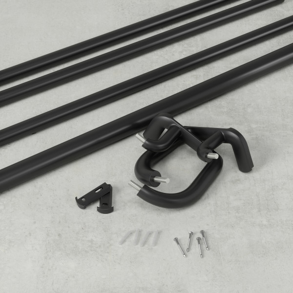 A prémium minőségű fém szerkezet rúdanként akár 10 kg terhelést is elbír, így tartós és megbízható megoldást nyújt. A matt fekete felület időtlen eleganciát sugároz, tökéletesen illeszkedve a modern lakberendezési stílusokhoz.