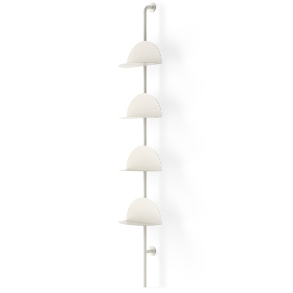 A Solis fali polcrendszer egyesíti a funkcionalitást és az esztétikát egy karcsú, vertikális kialakításban. A hajlított acélból készült félkör alakú polcok nem csak praktikus tárolófelületet biztosítanak, de egyedi dizájnelemként is szolgálnak. A rendszer különlegessége, hogy minden polc magassága és iránya egyénileg állítható, így személyre szabható a tárolótér.