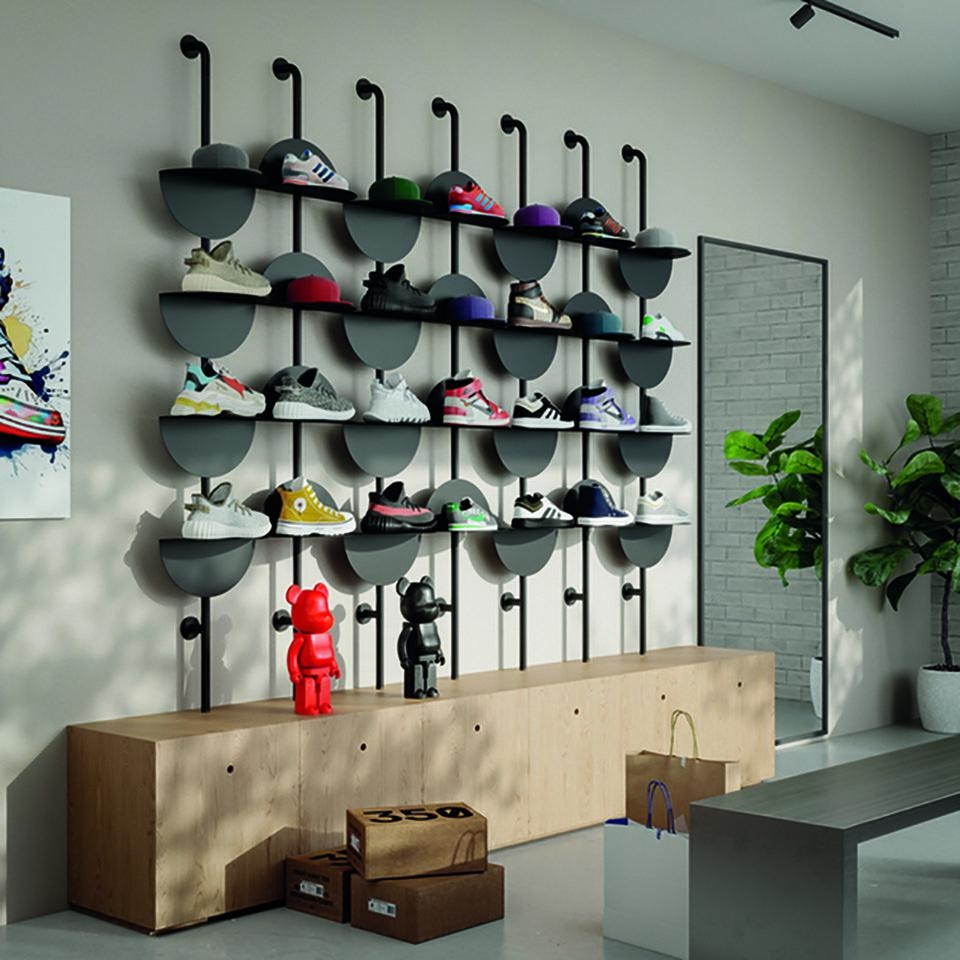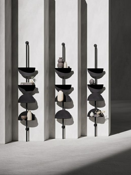 Az Umbra Solis fali polcrendszer egy elegáns és praktikus megoldás, amely ötvözi a funkcionalitást és a modern dizájnt. A rendszer egy karcsú függőleges oszlopból és négy állítható, félkör alakú polcból áll, amelyek hajlított acélból készültek. A polcok magassága és iránya egyedileg állítható, így személyre szabható a tárolótér.