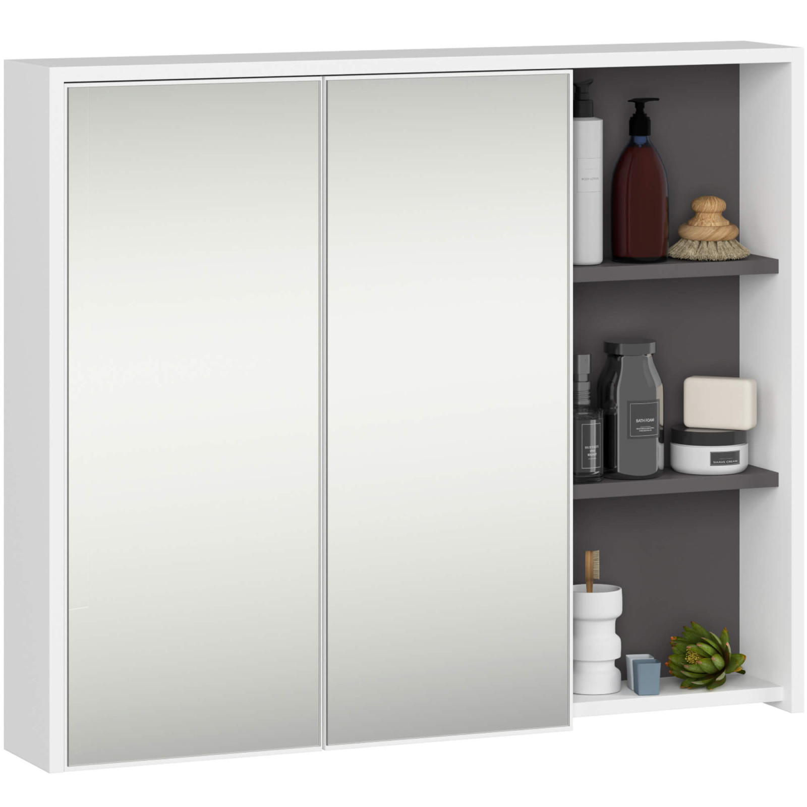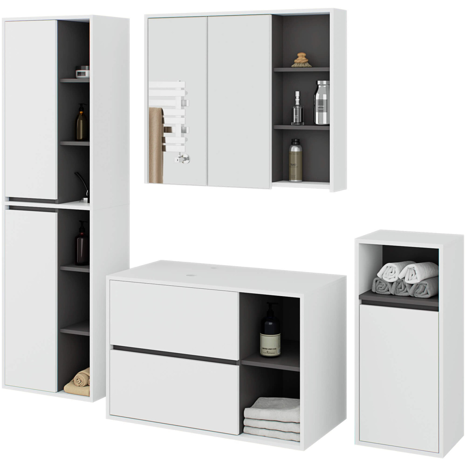 Modern, fali fürdőszobabútor szett praktikus tárolási megoldásokkal, matt fehér frontokkal és grafit belső kialakítással. Négy különálló elemből áll, amelyek tetszőleges elrendezésben szerelhetők fel.