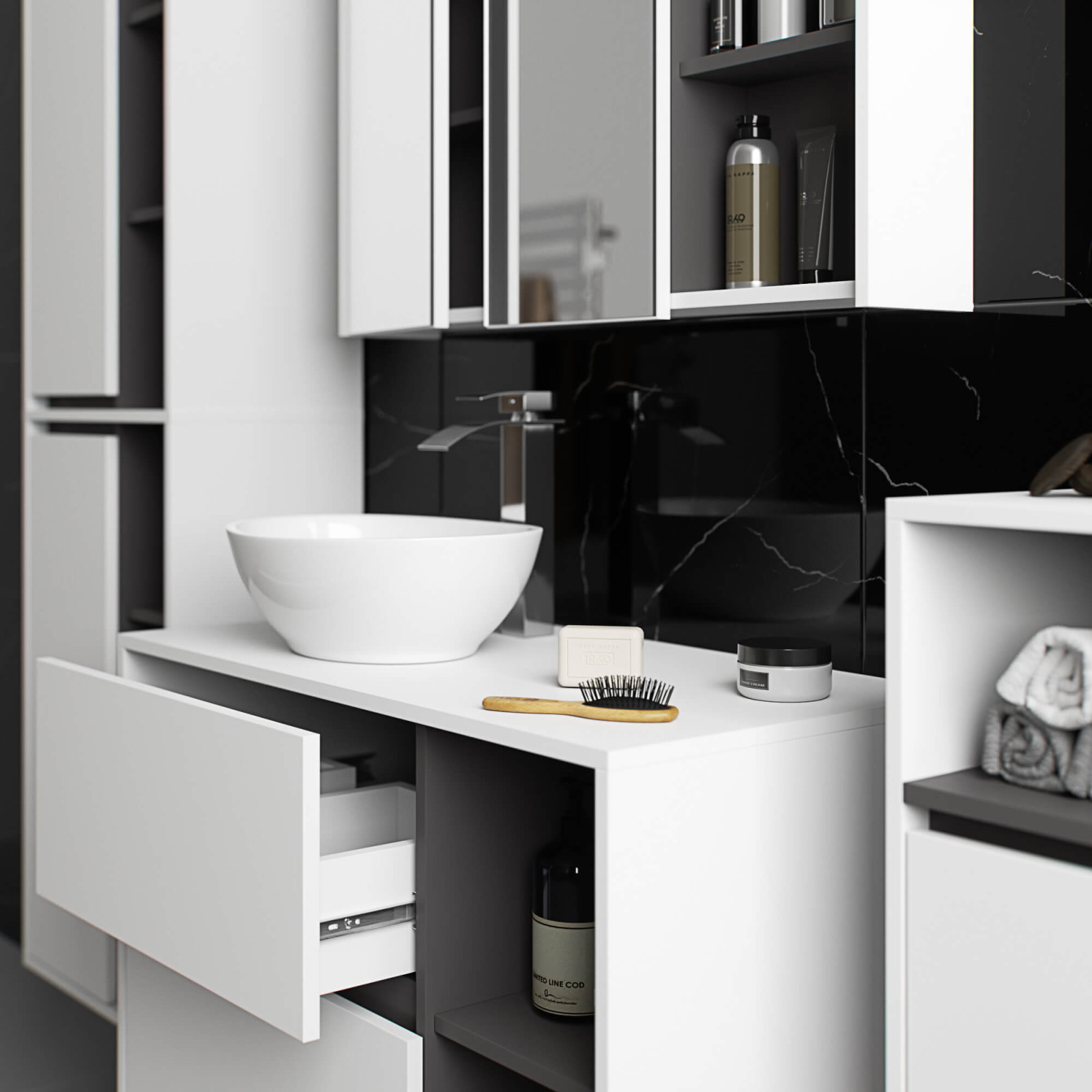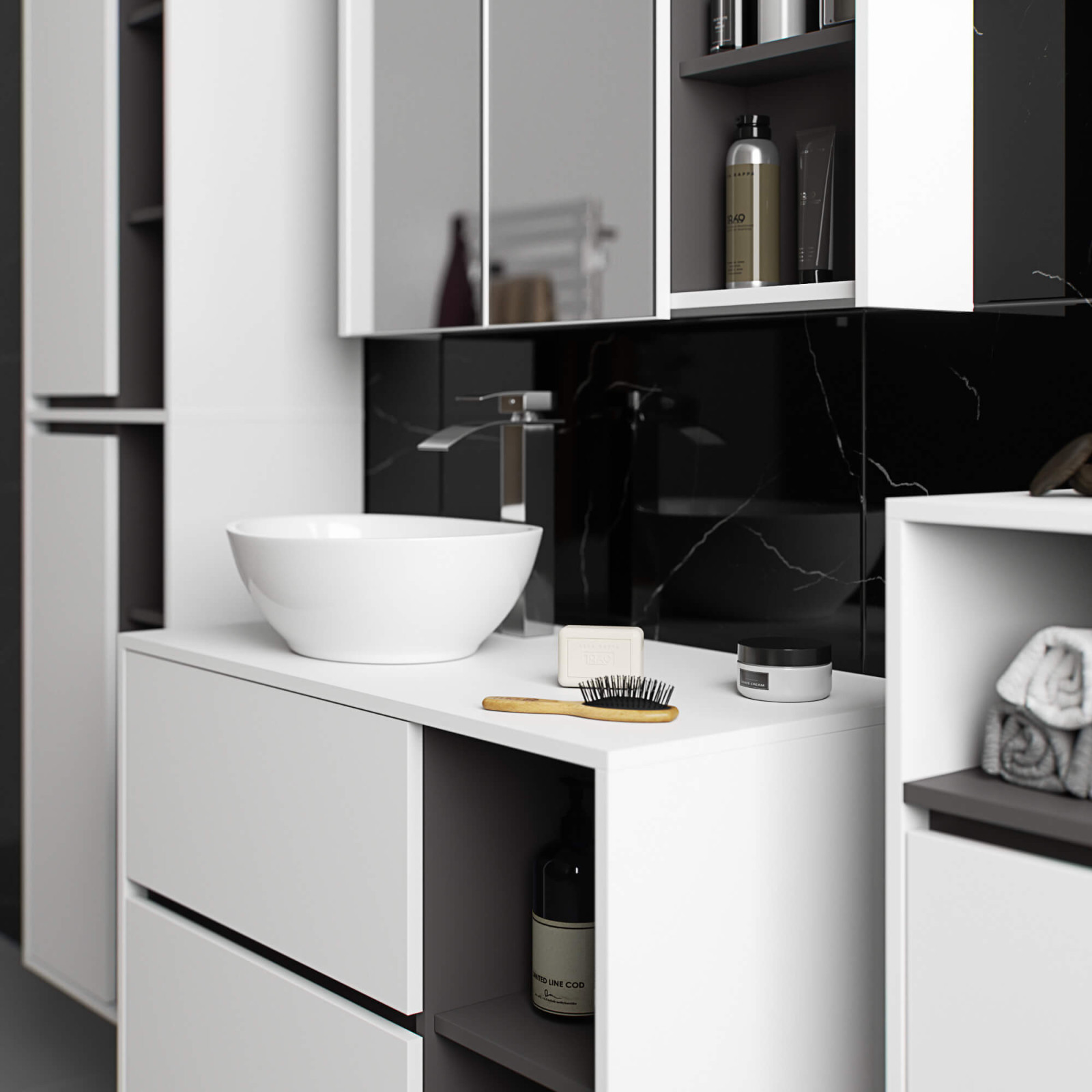 A VAMI fürdőszobabútor kollekció tökéletes választás a modern fürdőszobákba. A matt fehér külső és grafit belső színvilág elegáns kontrasztot alkot, míg a nyitott polcok és zárt tárolóelemek praktikus kombinációja maximális funkcionalitást biztosít. A 16 mm vastag laminált bútorlapból készült szekrények strapabíró ABS élzárással rendelkeznek.