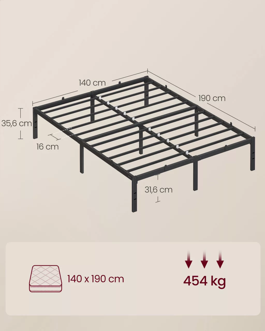 A VASAGLE mattfekete fém ágykeret tökéletes választás azok számára, akik a funkcionalitást és az elegáns dizájnt egyaránt értékelik. A masszív acélcsövekből készült konstrukció 9 lábbal és szilárd ágyrácscsal biztosítja a kiváló stabilitást, akár 450 kg terhelhetőséggel. A mattfekete felület és a letisztult vonalak visszafogott eleganciát kölcsönöznek a hálószobának, miközben különböző berendezési stílusokhoz is tökéletesen illeszkedik.