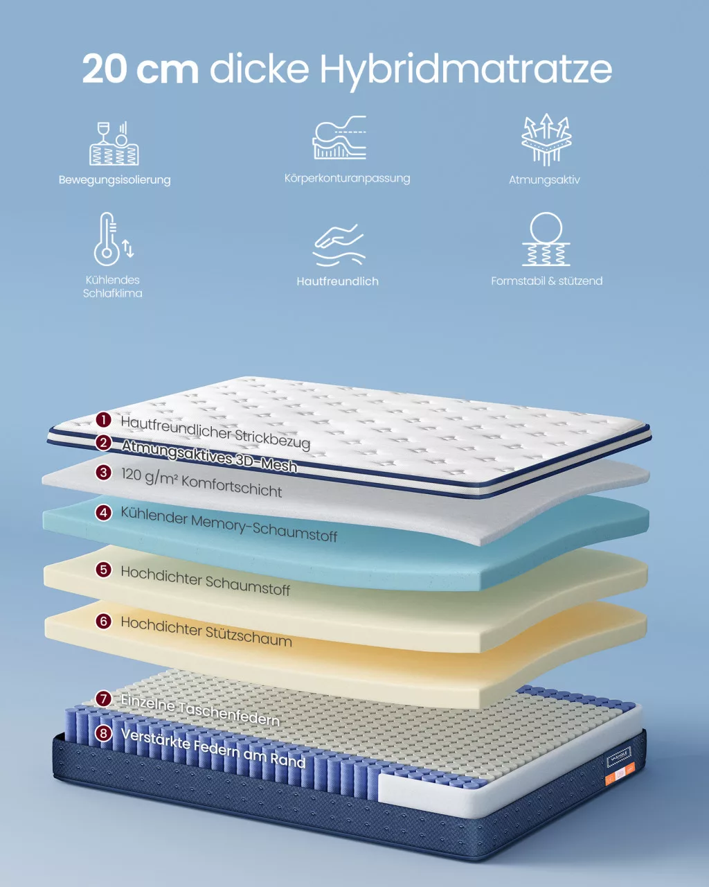 VASAGLE 140 x 200 x 20 cm zsebrugós matrac gél memóriahabbal közepes kemény H3 7 zónás támogatás kék