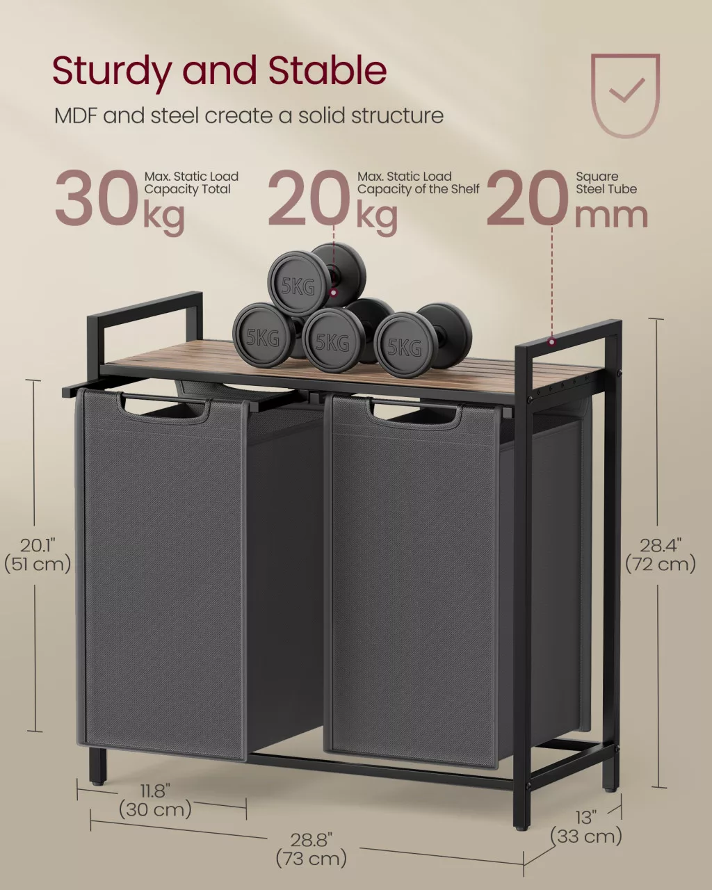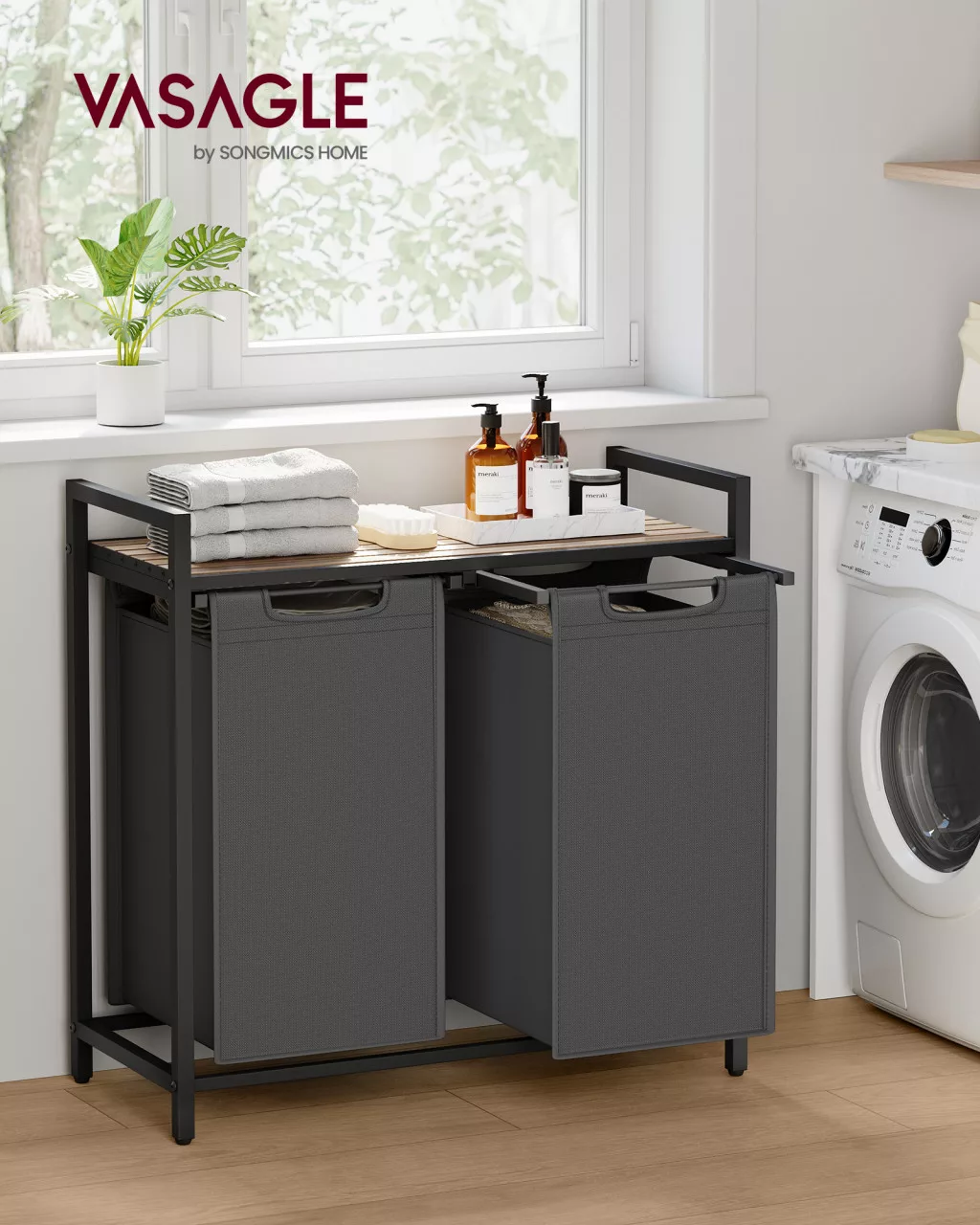 VASAGLE 2 rekeszes szennyeskosár fém vázzal polccal karamell barna és szürke