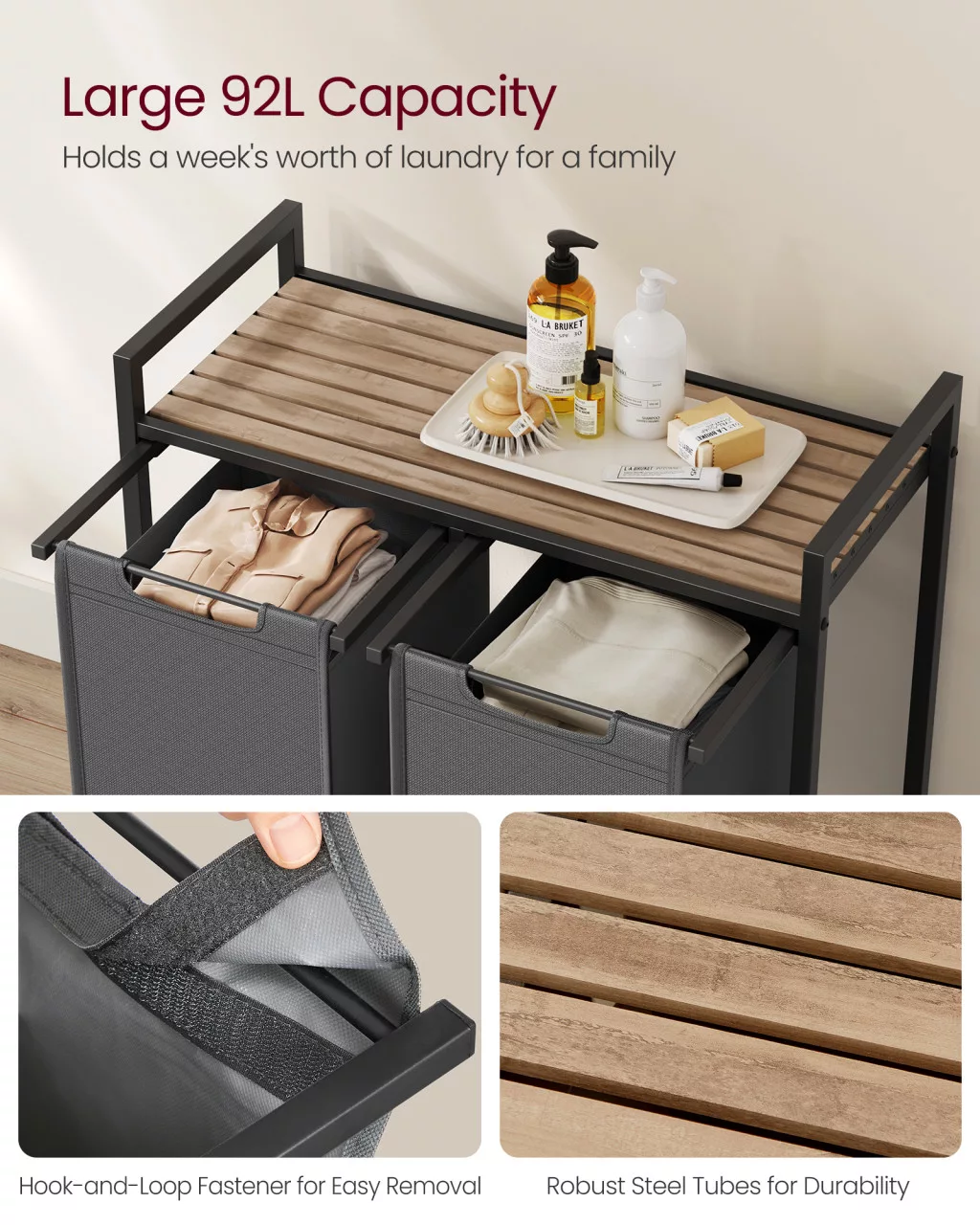 Ez a VASAGLE szennyeskosár a tökéletes megoldás azok számára, akik szeretnék rendszerezni mosandó ruháikat. A 2 rekeszes kialakítás lehetővé teszi a világos és sötét ruhák külön tárolását, míg a 92 literes összkapacitás (2 x 46 liter) bőséges helyet biztosít a heti mosáshoz. A strapabíró fém váz és az MDF panel garantálja a stabilitást, míg a vízlepergető Oxford szövet táskák könnyen tisztíthatók és karbantarthatók.