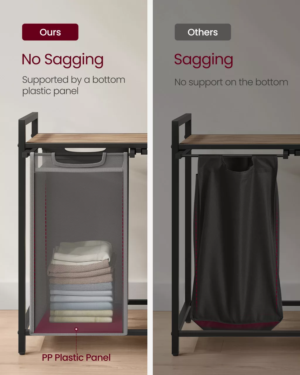 A felső polc további tárolóhelyet kínál mosószerek, öblítők vagy fürdőszobai kellékek számára, a rácsos kialakítás pedig biztosítja a levegő áramlását, megelőzve a kellemetlen szagok kialakulását. A kihúzható és levehető táskák tépőzárral rögzíthetők, így könnyedén szállíthatók a mosógéphez. A négy állítható láb stabilitást biztosít egyenetlen felületeken is, így ez a sokoldalú szennyeskosár tökéletesen illeszkedik mosókonyhába, fürdőszobába vagy hálószobába.