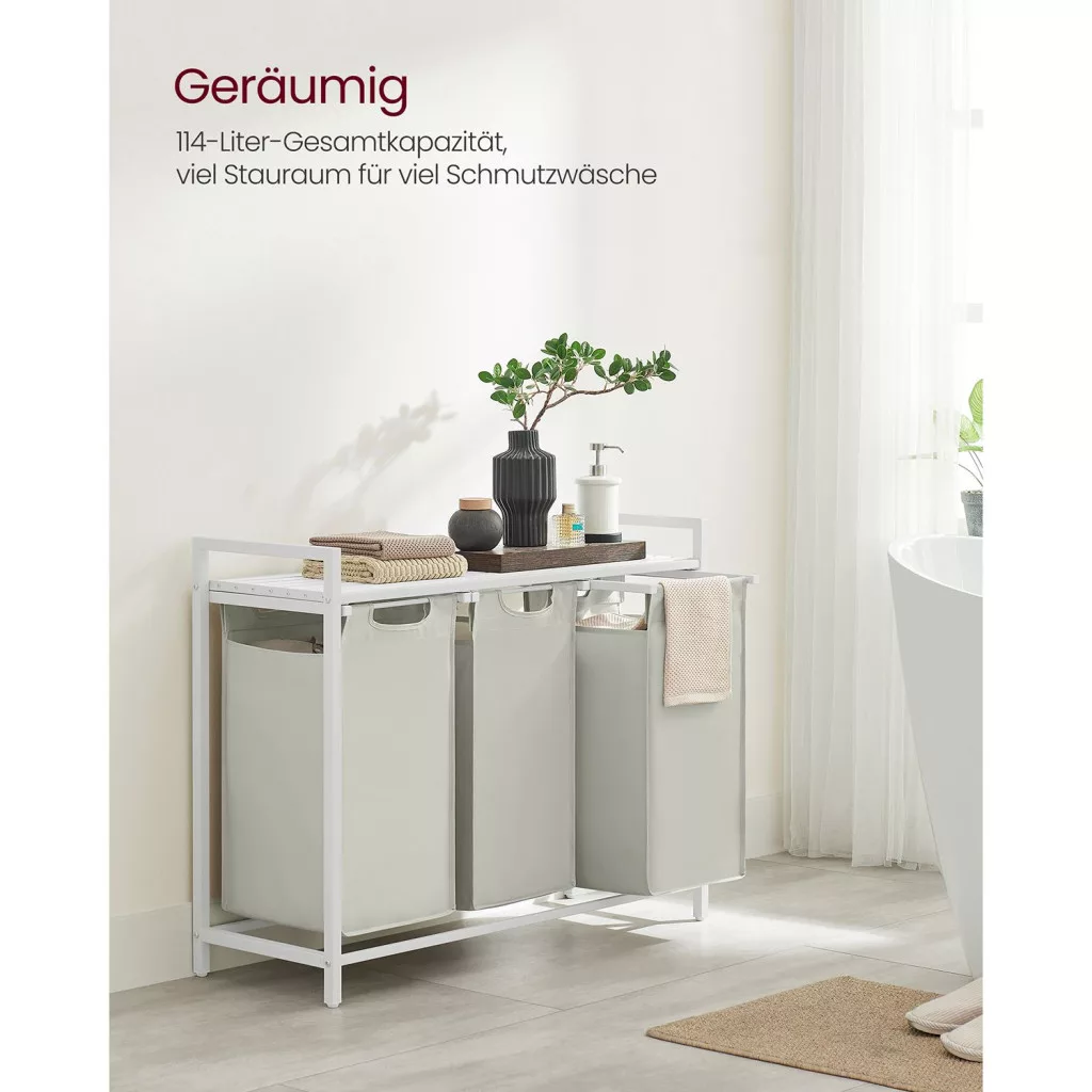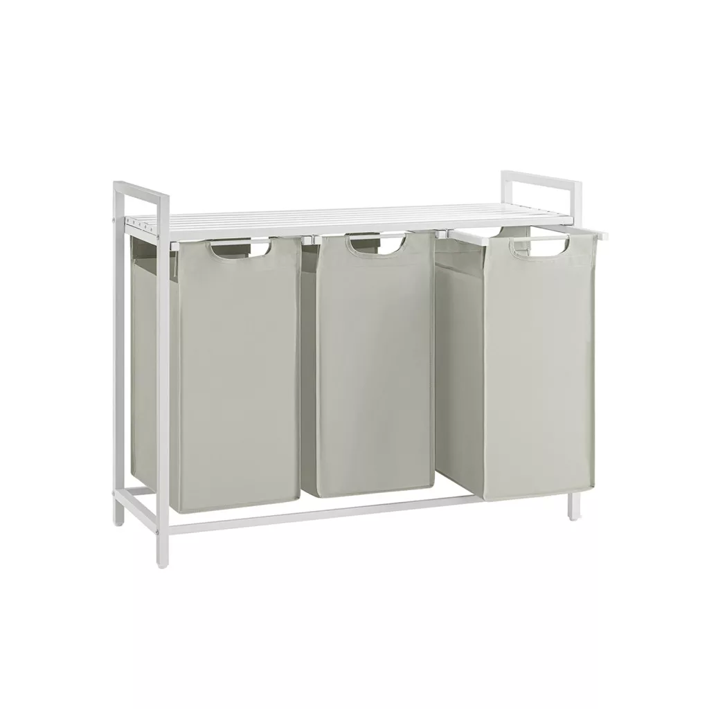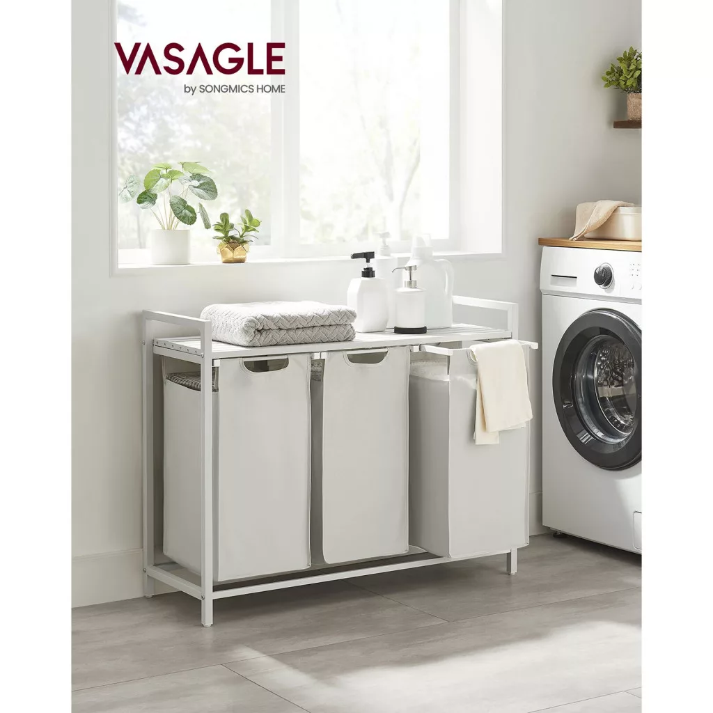 Ez a modern VASAGLE szennyestartó három 38 literes, kivehető zsákkal rendelkezik, amelyek lehetővé teszik a világos és sötét ruhák praktikus szétválogatását. A stabil acélváz és az MDF polc kombinációja nem csak tartós konstrukciót biztosít, de extra tárolóhelyet is kínál tisztítószerek és mosodai kellékek számára.
