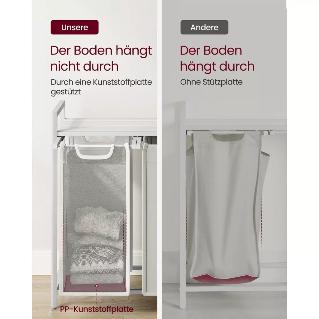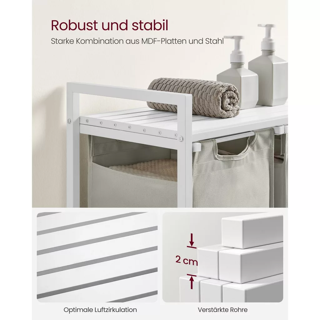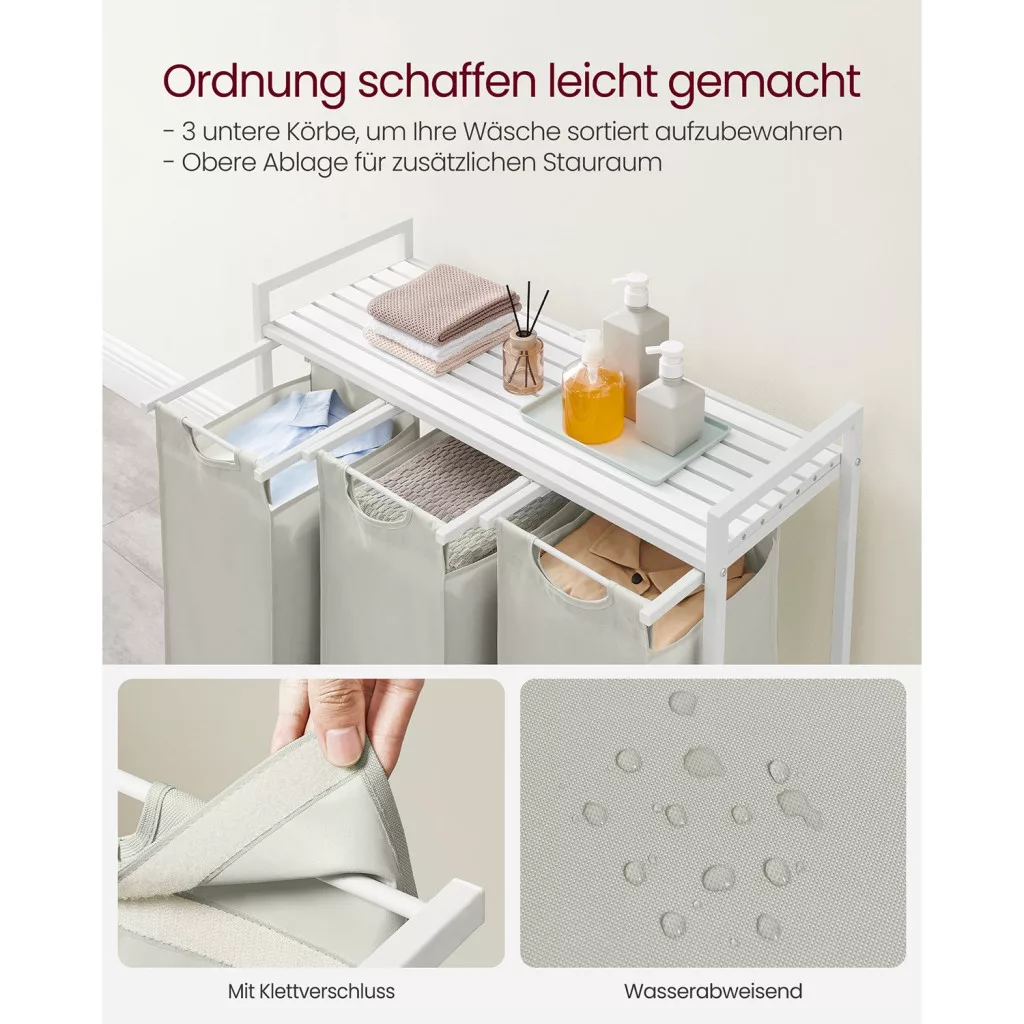 Ez a modern VASAGLE szennyestartó három 38 literes, kivehető zsákkal rendelkezik, amelyek lehetővé teszik a világos és sötét ruhák praktikus szétválogatását. A stabil acélváz és az MDF polc kombinációja nem csak tartós konstrukciót biztosít, de extra tárolóhelyet is kínál tisztítószerek és mosodai kellékek számára.