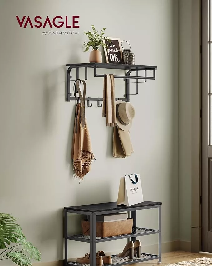 VASAGLE 3-az-1-ben Fali Fogas Polccal Antracit-Fekete