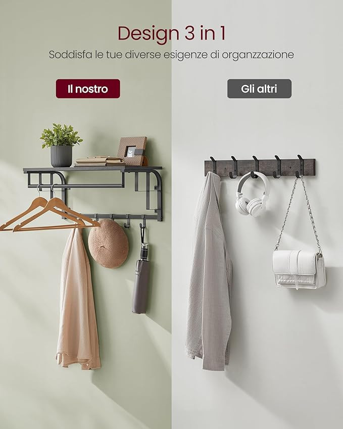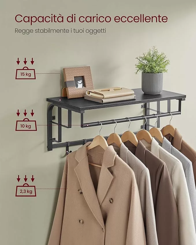 • 3-az-1-ben multifunkciós kialakítás: polc, ruhaakasztó rúd és 5 akasztó egy termékben