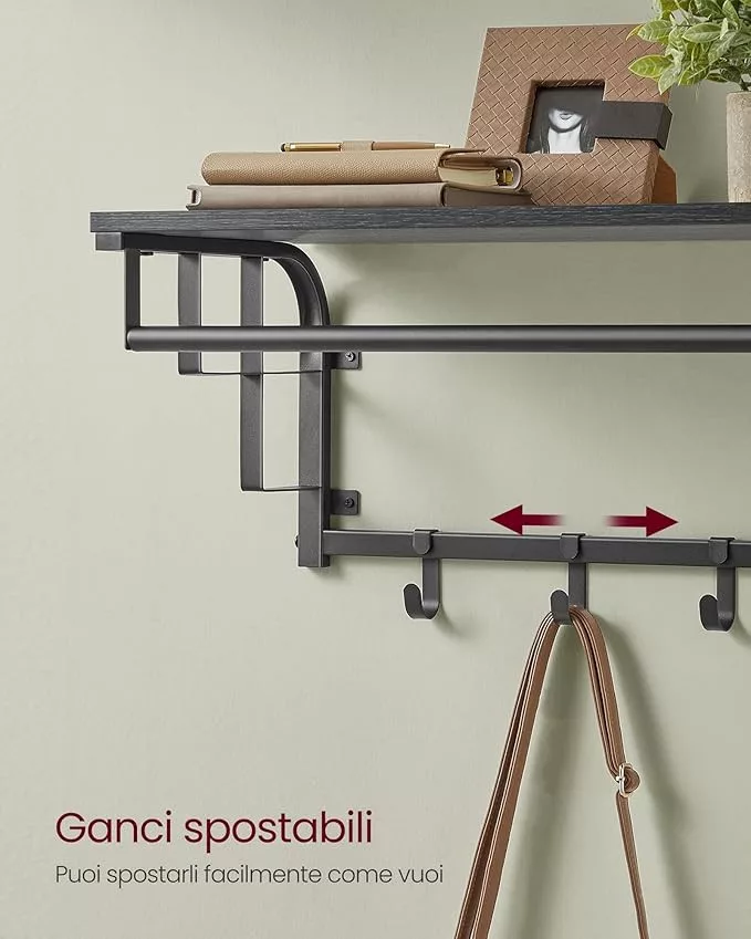 Többfunkciós fali fogas polccal, ruhaakasztó rúddal és 5 levehető akasztóval, amely tökéletes megoldást nyújt az előszoba vagy gardrób rendszerezéséhez.