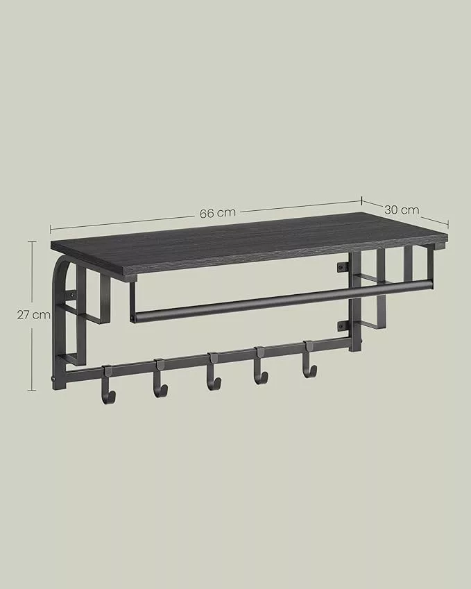 Ez az elegáns fali fogas egyesíti magában a polc, ruhaakasztó rúd és akasztók funkcióit egy kompakt kialakításban. A 66 cm széles polc ideális dekorációk vagy mindennapi tárgyak tárolására, míg az acél ruhaakasztó rúd és az 5 levehető akasztó maximális rugalmasságot biztosít kabátok, táskák és kiegészítők rendszerezett tárolásához.