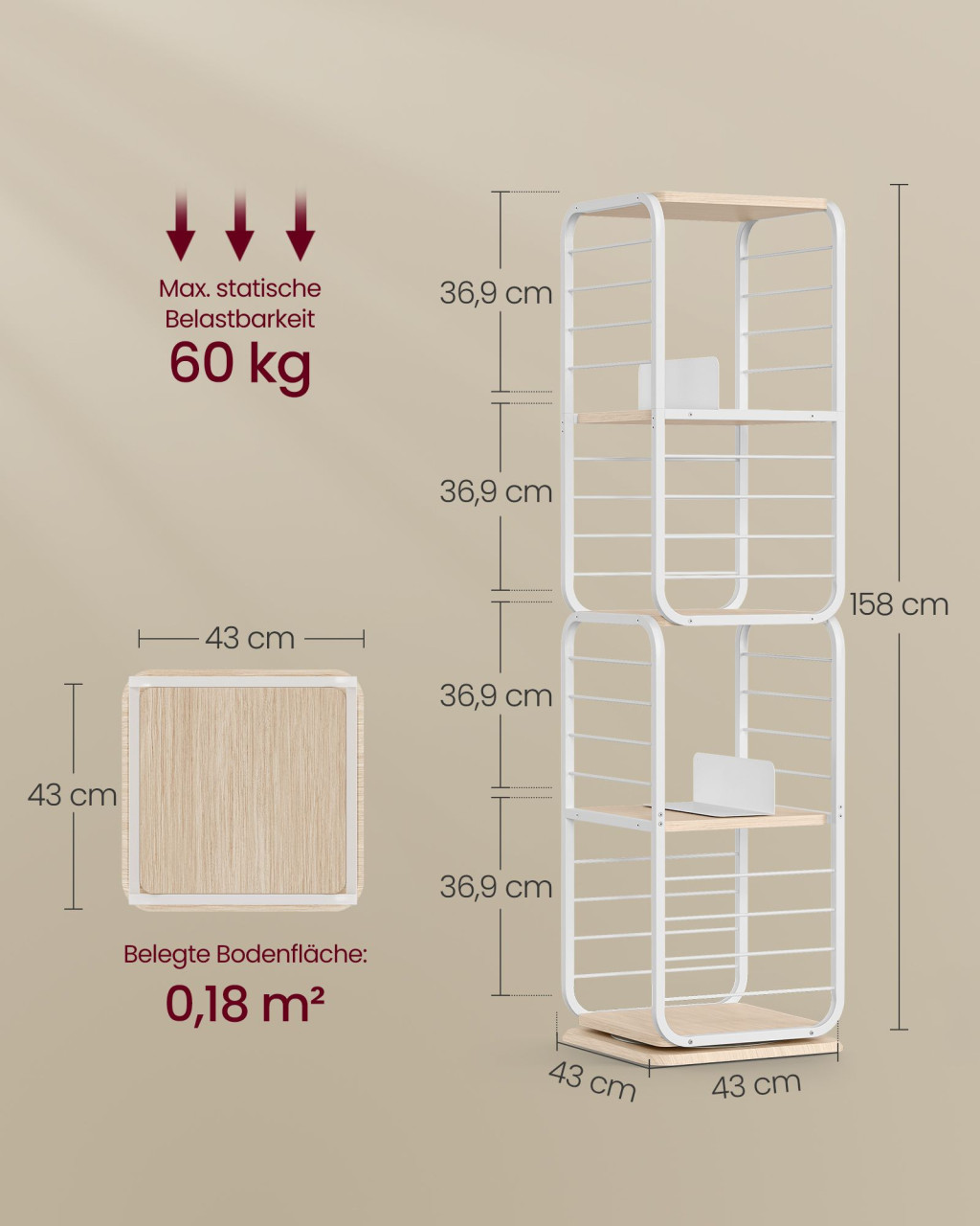 Ez a modern könyvespolc egyesíti a praktikumot és az esztétikumot. A 360 fokos forgó mechanizmusnak köszönhetően minden könyv könnyen elérhető, míg az oldalsó védőrácsok megakadályozzák a tárgyak leesését. A négy tágas polc körülbelül 80-100 átlagos méretű könyv tárolására alkalmas.