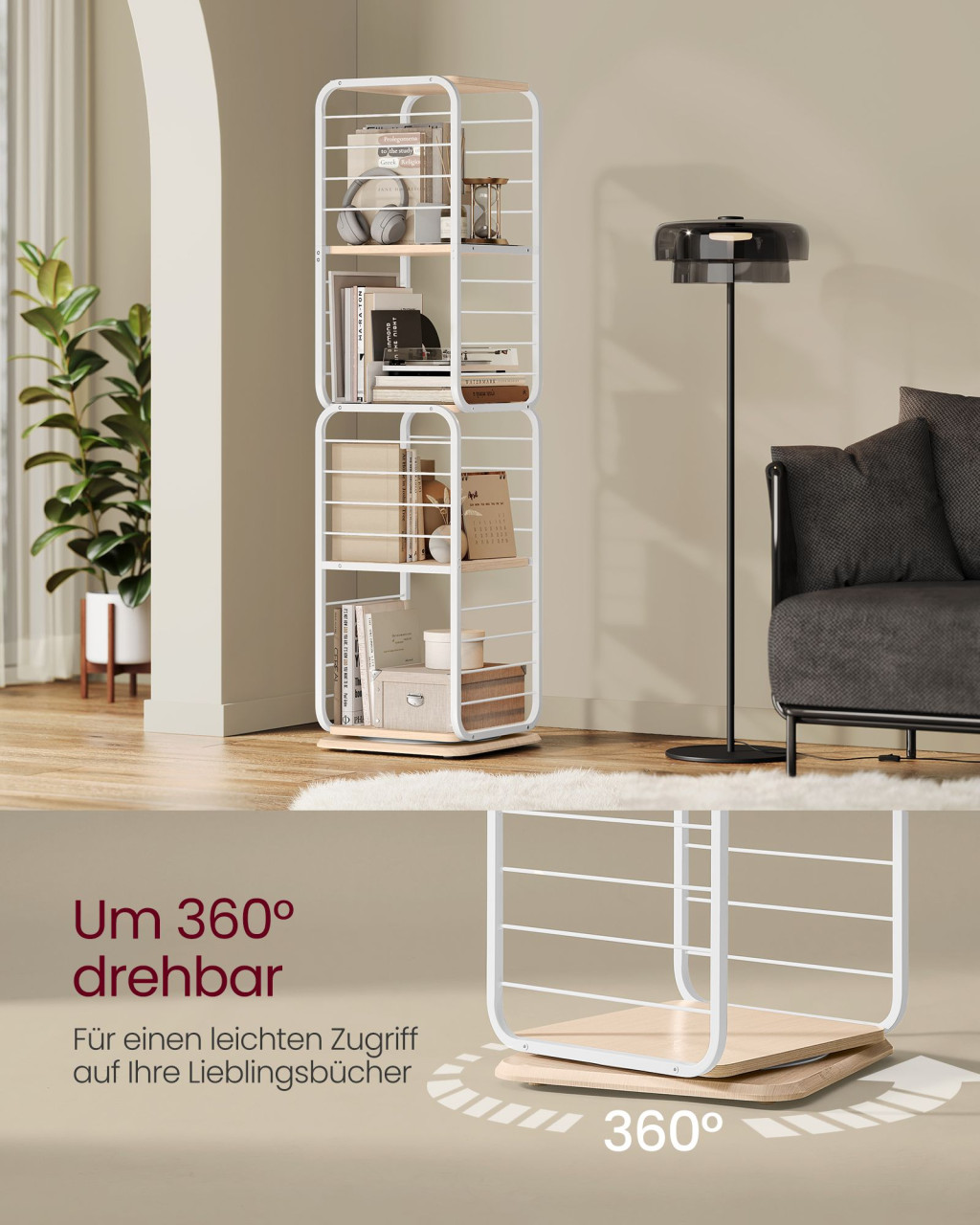 VASAGLE 360° Forgó Könyvespolc Természetes Bézs és Fehér Acélvázzal