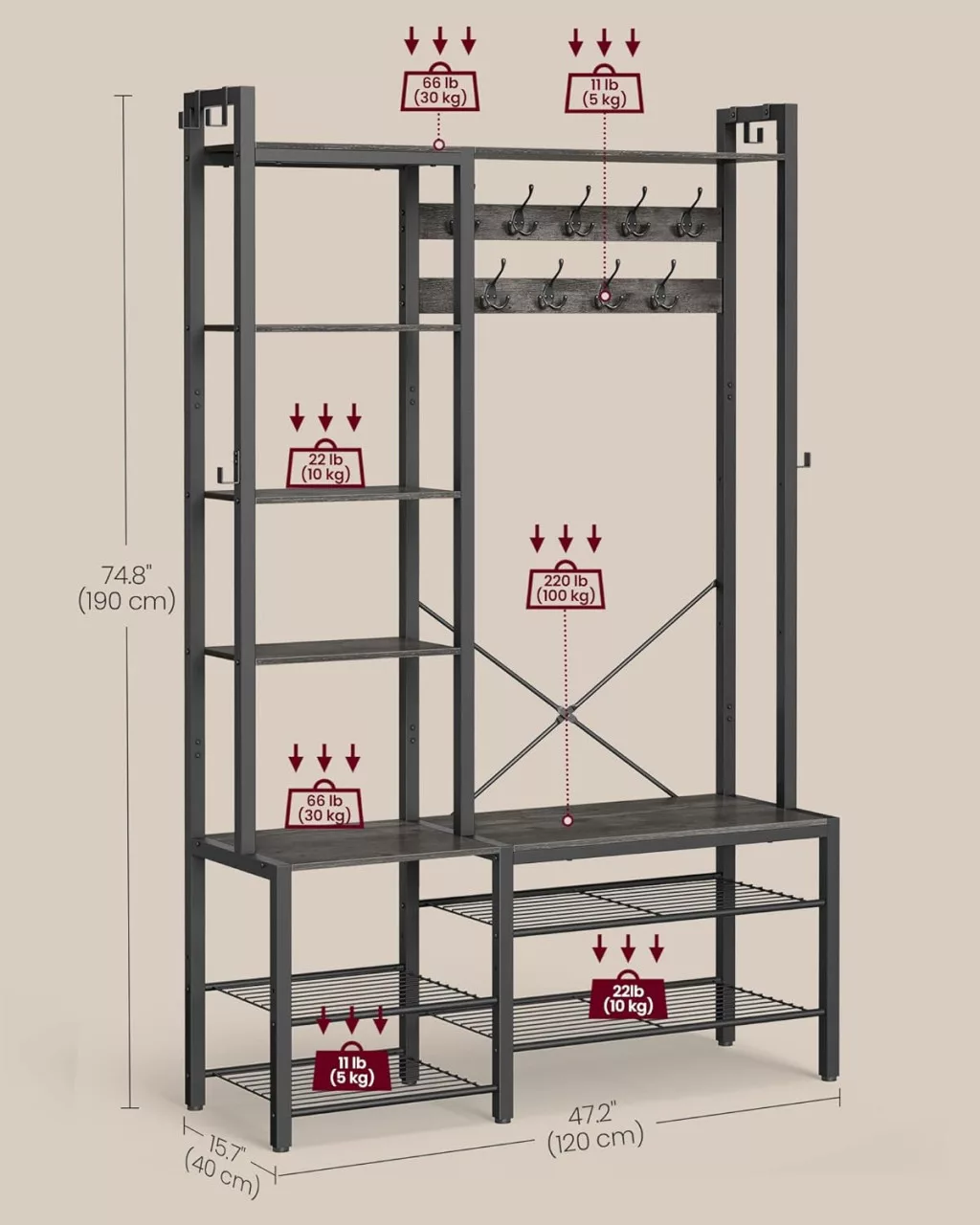 VASAGLE 4-az-1-ben Előszobai Állvány Paddal Kőszürke-Fekete