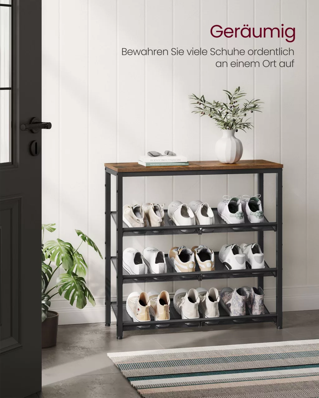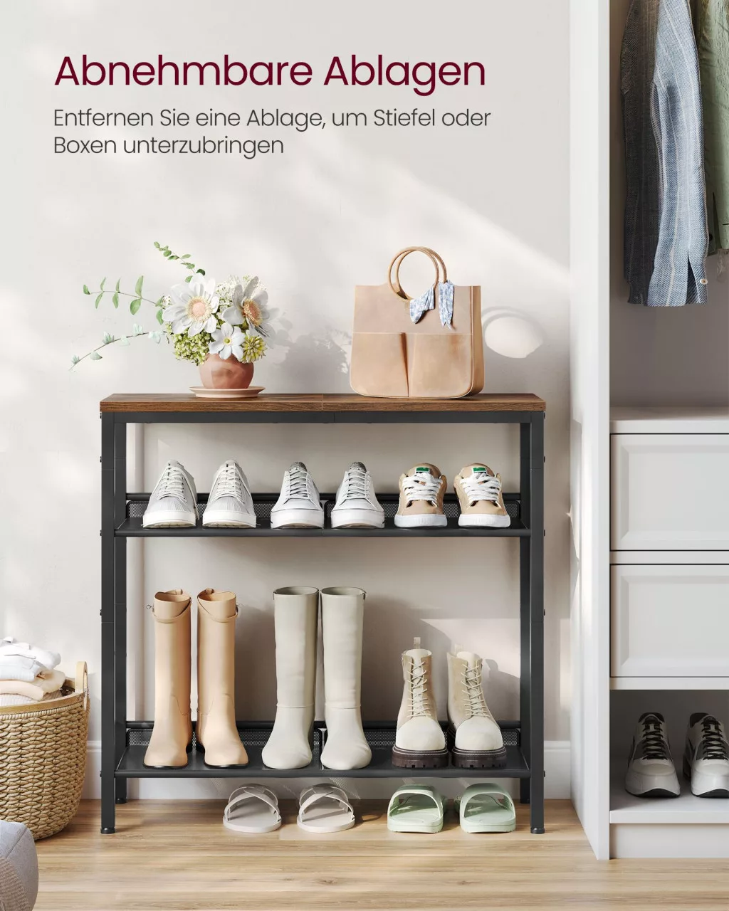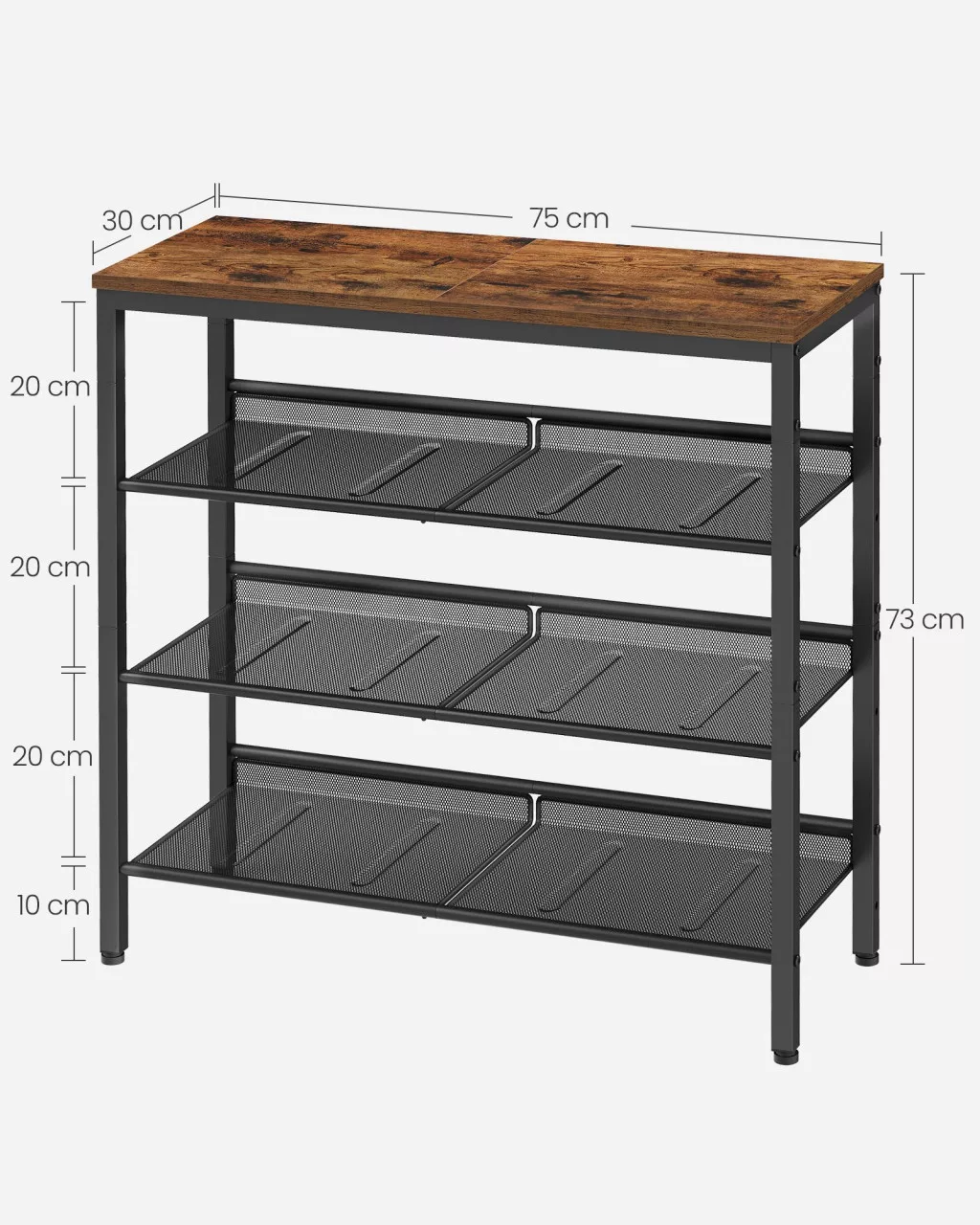 A VASAGLE 4-szintes cipőtartó polc a tökéletes megoldás azok számára, akik szeretnék rendszerezetten és stílusosan tárolni cipőiket. A rusztikus barna felső lap és a fekete acél váz kombinációja egyedi ipari hangulatot teremt, amely bármely előszobát vagy folyosót feldobhat. A három állítható hálós polc 15-20 pár cipő befogadására alkalmas, beleértve a magassarkúkat és magas szárú cipőket is, köszönhetően a polcok közötti 20 cm-es távolságnak.