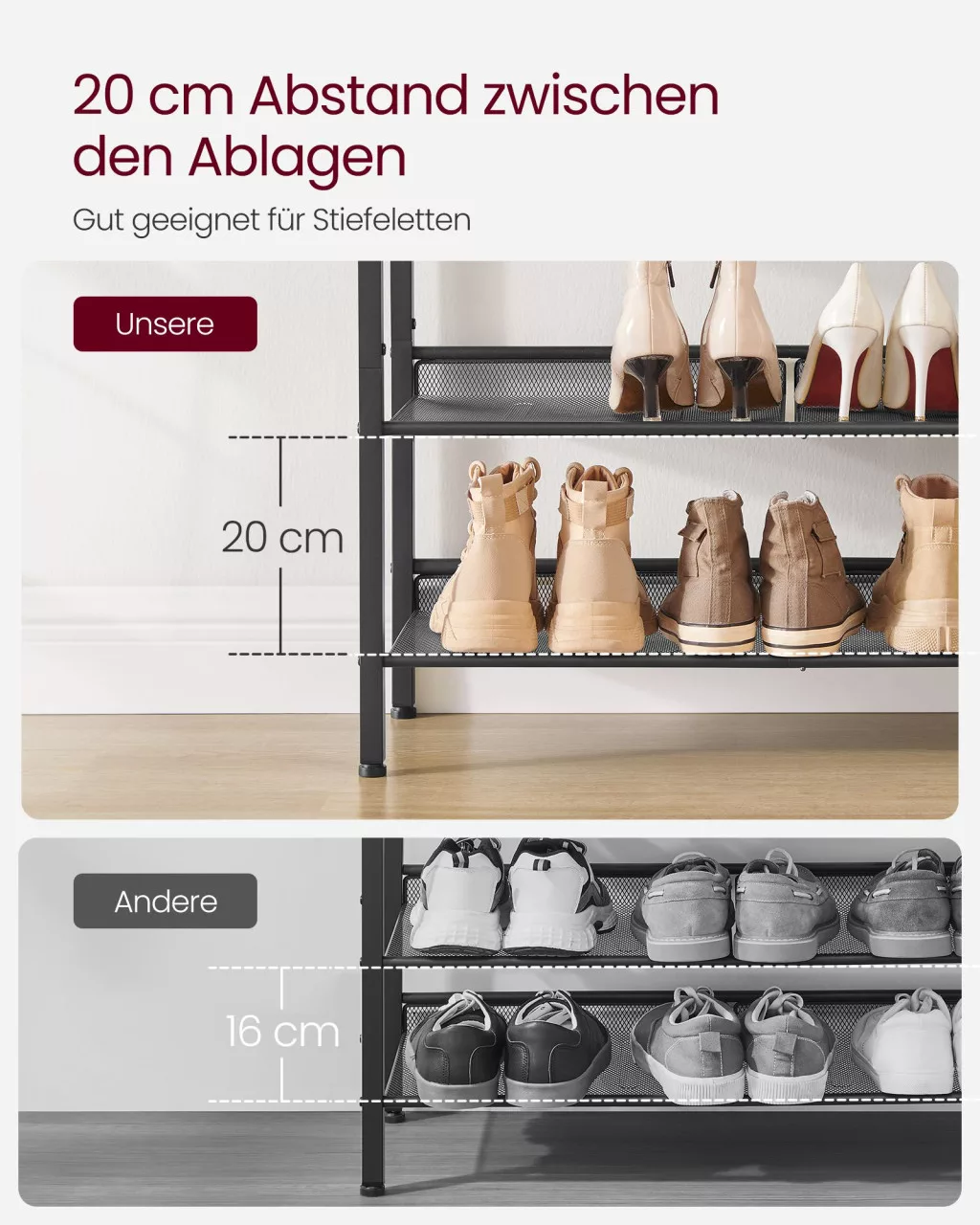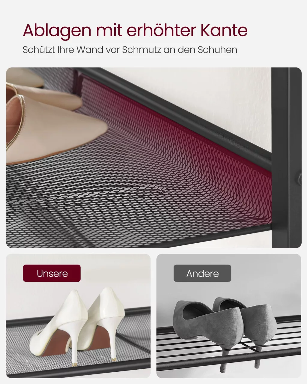 • Megemelt polcszélek: A polcok megemelt széle megakadályozza, hogy a cipők a falhoz érjenek, így a fal tisztán marad és a cipők biztonságosan a helyükön maradnak