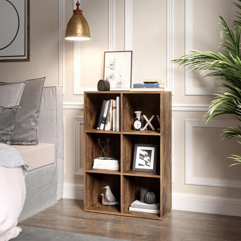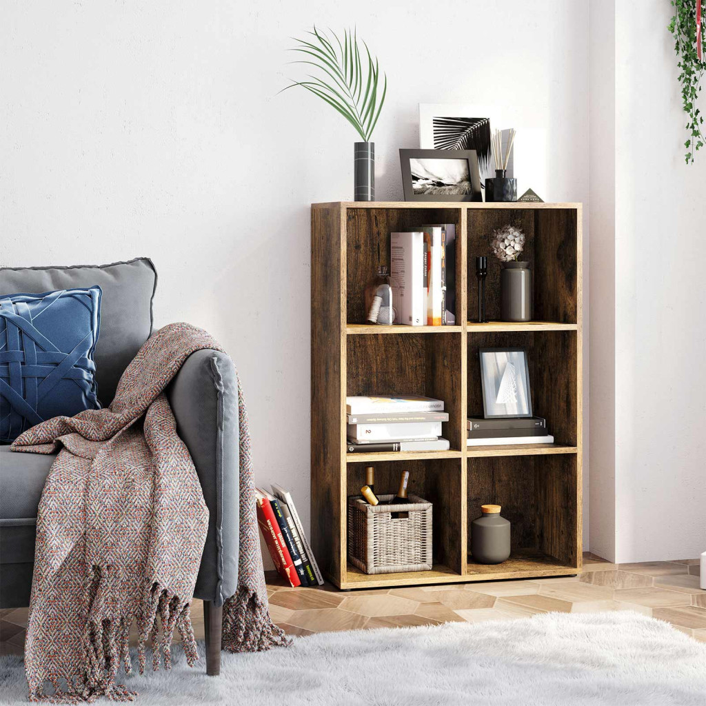 Sokoldalú, 6 rekeszes tárolórendszer rusztikus barna kivitelben, amely tökéletes megoldást nyújt könyvek, dekorációk és személyes tárgyak rendszerezett tárolására.