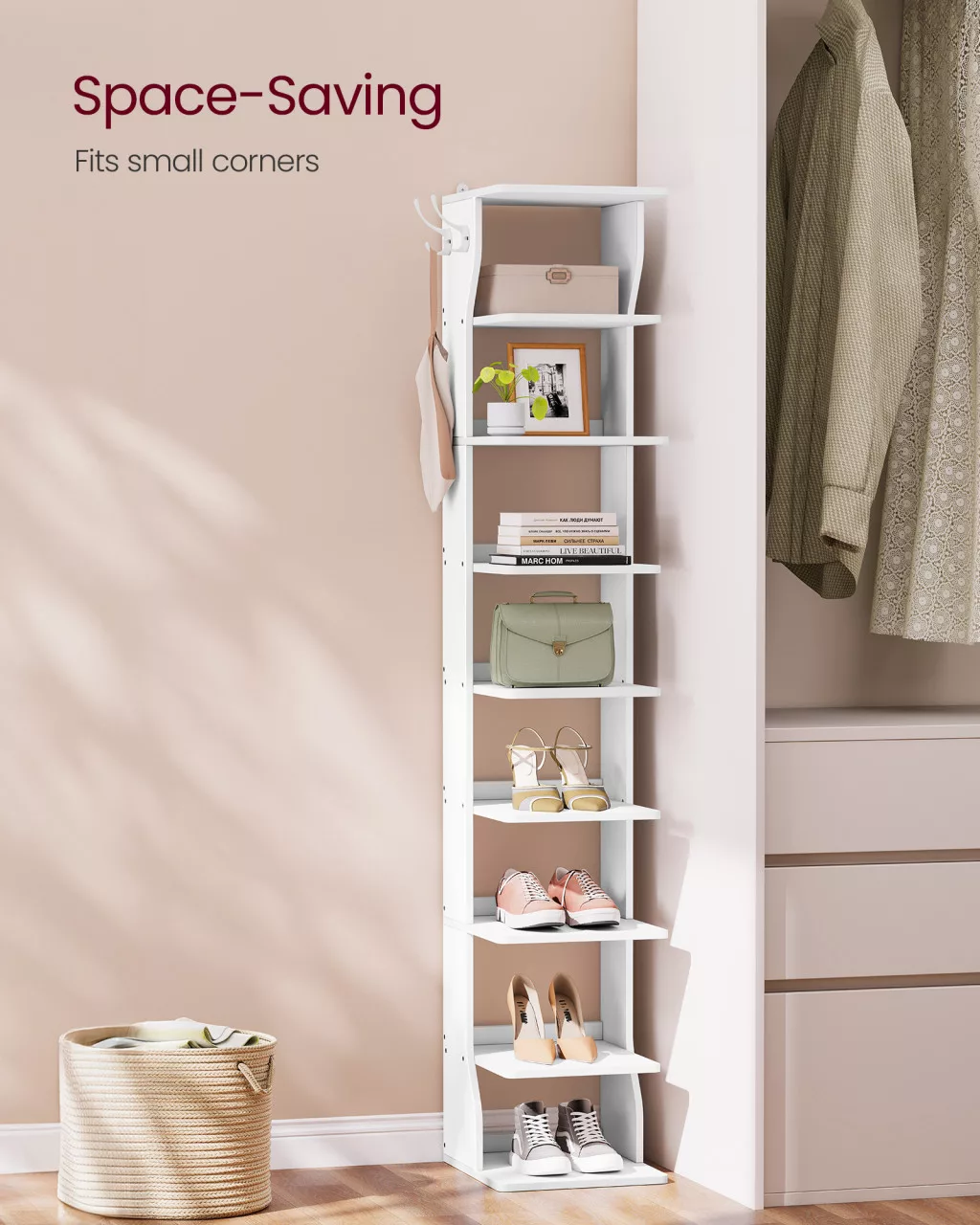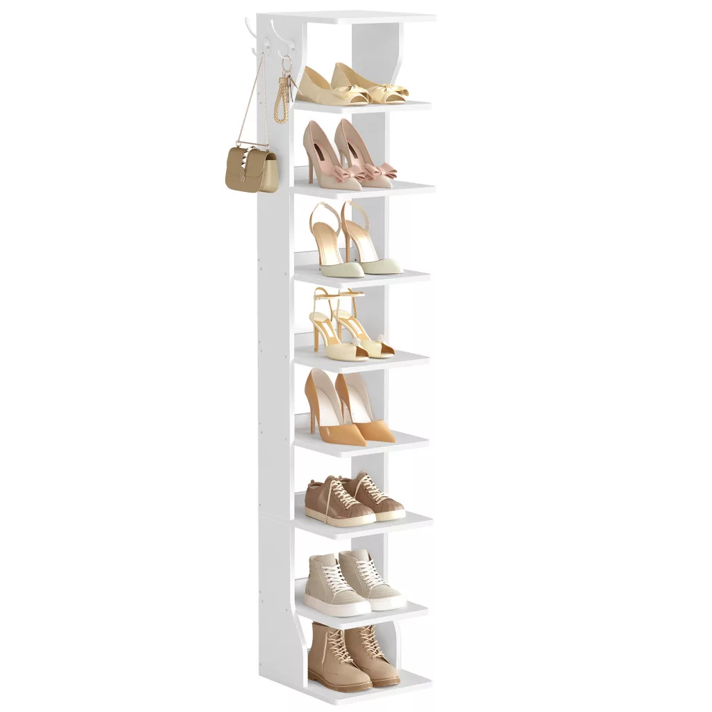 Ez a karcsú, 9 szintes cipőtartó állvány tökéletes megoldás kis terekhez, ahol a helytakarékosság kulcsfontosságú. A matt fehér dizájn elegánsan illeszkedik bármely előszoba vagy gardrób stílusához, miközben praktikus akasztókkal is rendelkezik kulcsok és táskák tárolására.